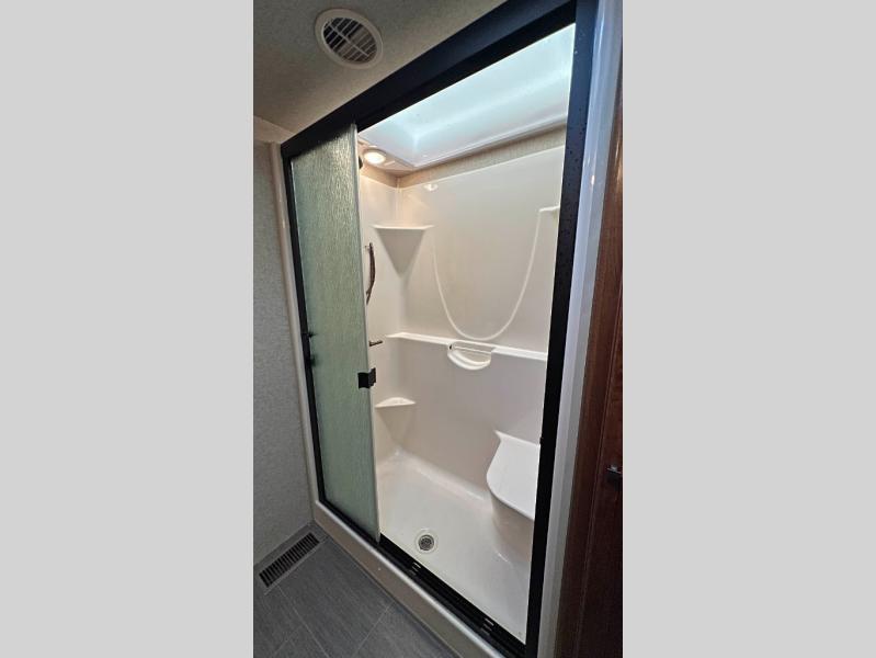 Back to the main entry turn left and find a wide open combined kitchen and living area to enjoy. There is a slide out dining table with four chairs, and optional theater seating for two. Along the rear wall there is a sofa with storage overhead and two end tables for your things. An entertainment center can be found nearby adjacent to the sofa, and opposite the theater seating slide out.