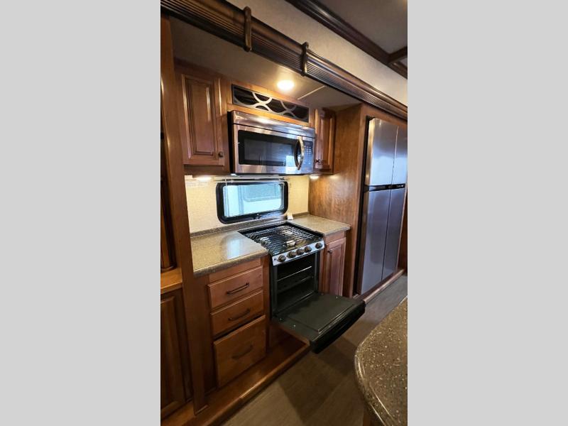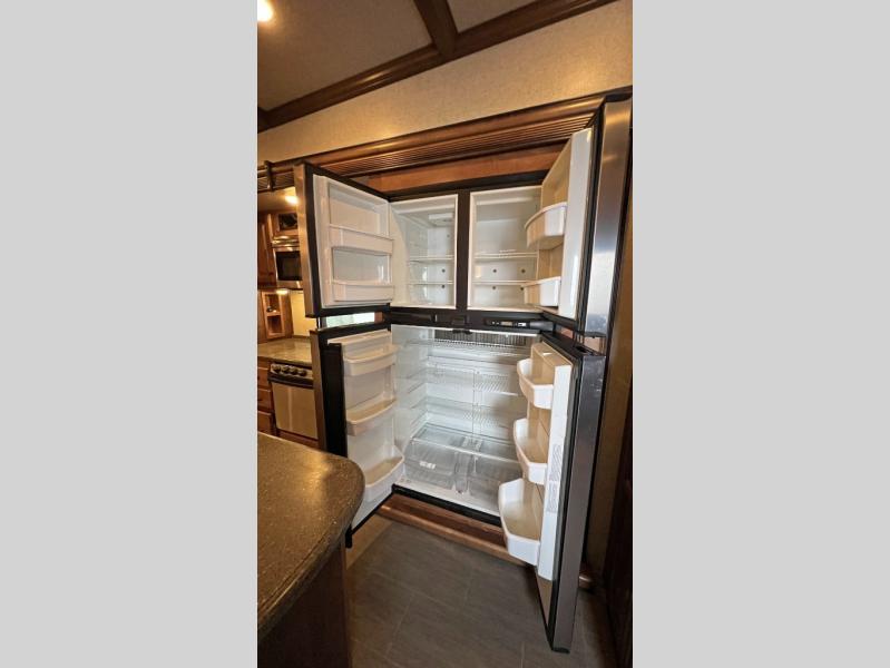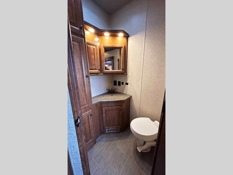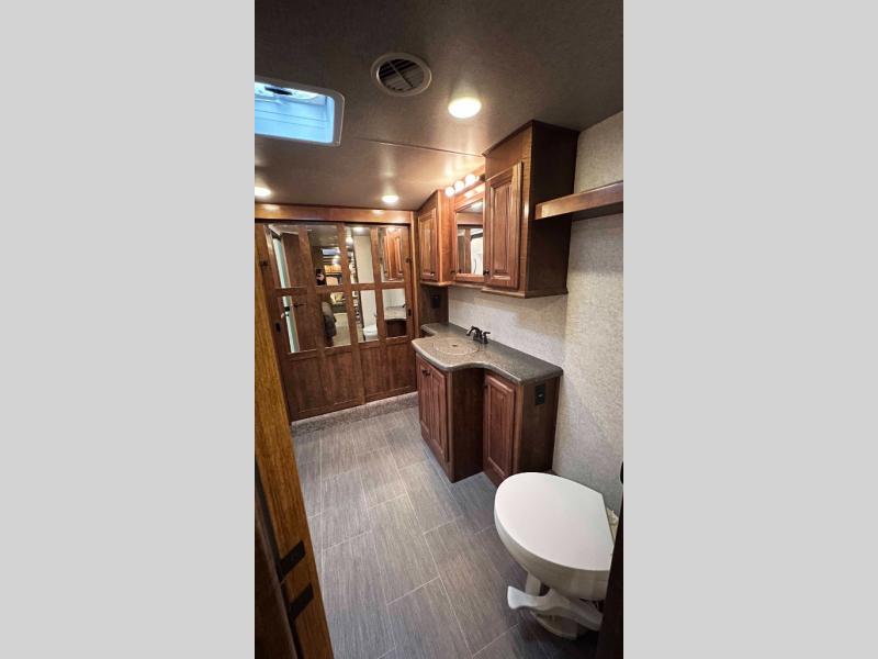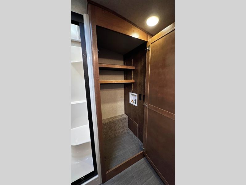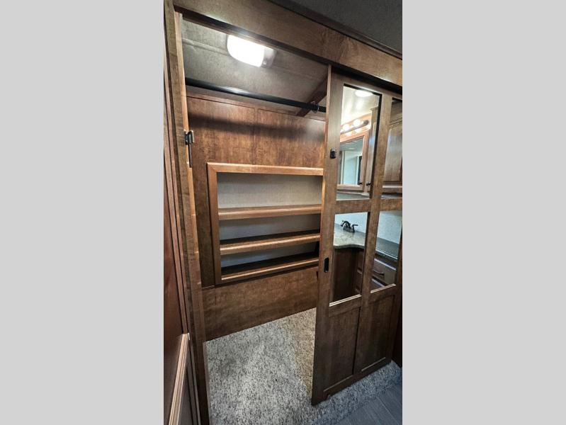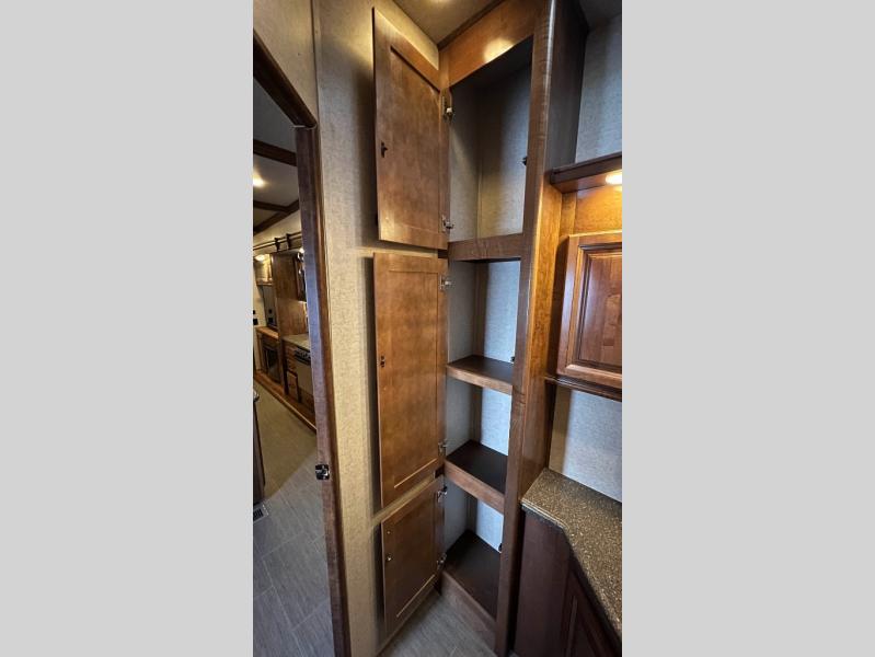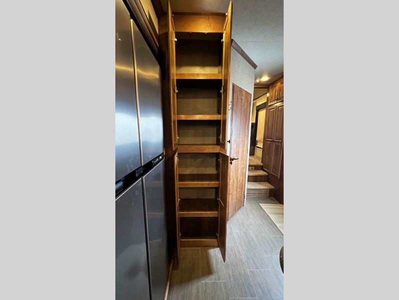 Step inside model 3950 FB and notice the half bath straight in through the door. There is a toilet, a corner vanity with sink, and storage. Just outside the bathroom door you will find additional storage along the interior just off the refrigerator slide out. There is also a second pantry to the right of the door as you head up to the front master bedroom and en suite bath.