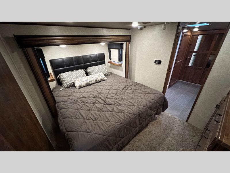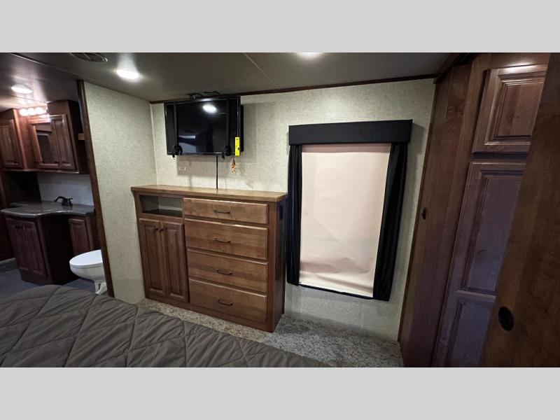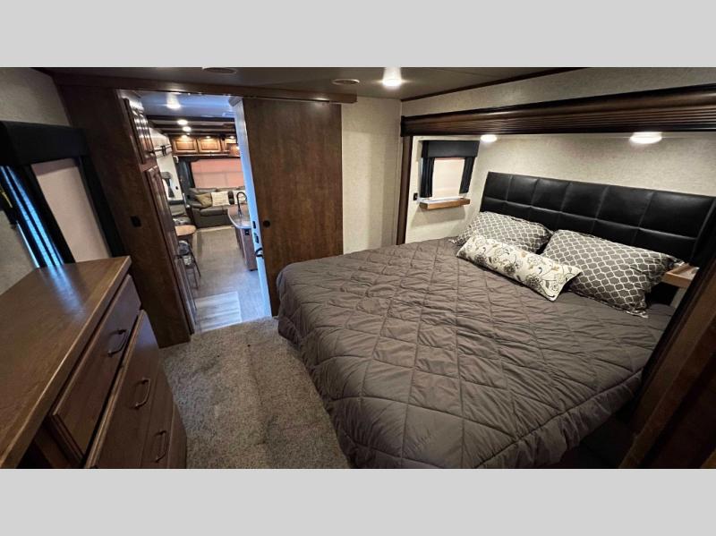 The bedroom features a king bed slide out with a dresser opposite the bed along the curb side wall. There are two sets of sliding doors to close off the space for privacy at night.