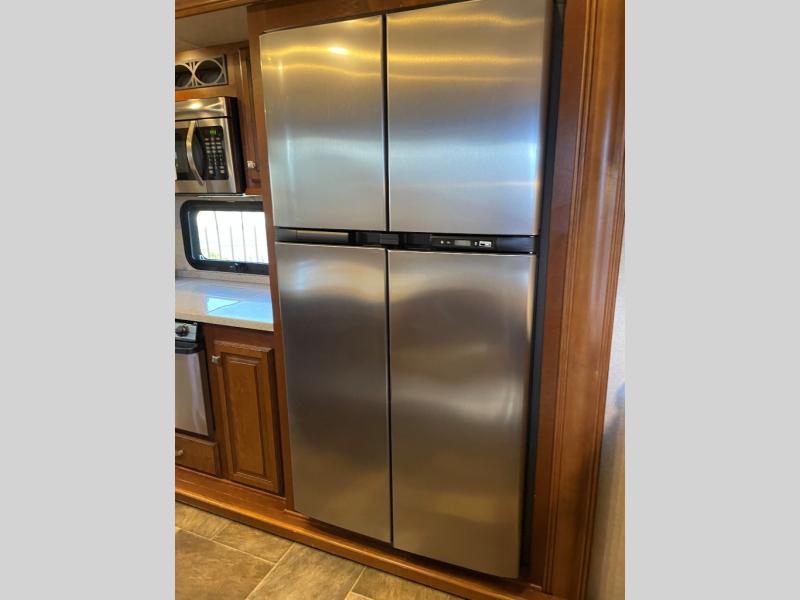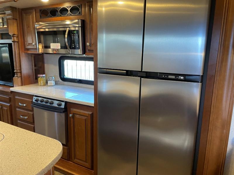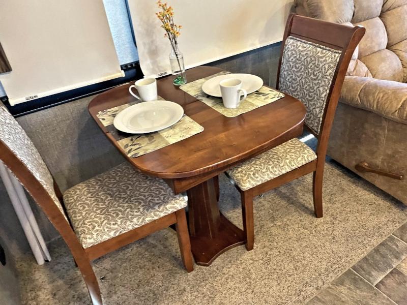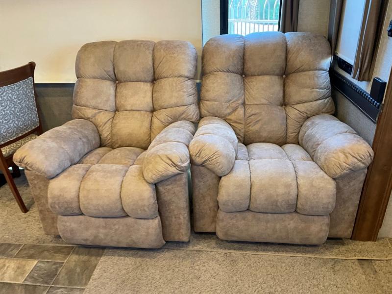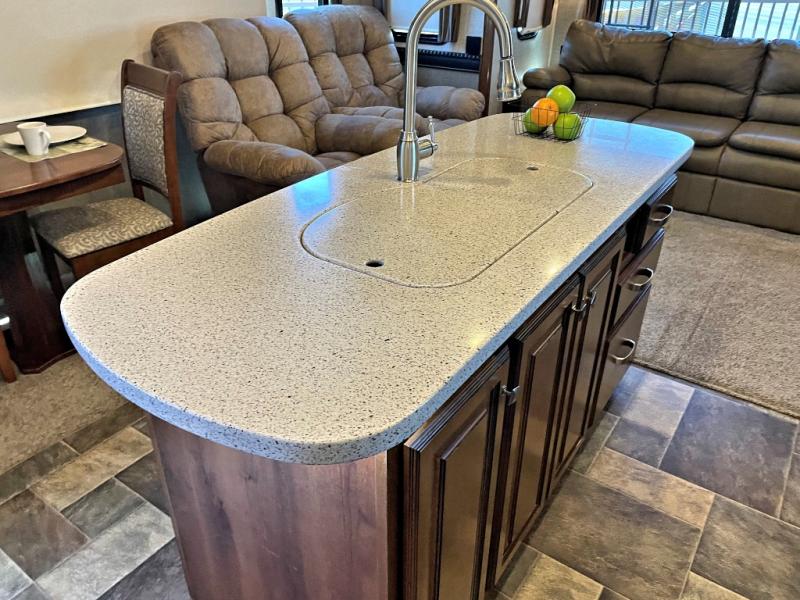 Step in and see how comfortable your next camping trip would be. There is a dining table for two within a slide out that also contains two swivel glider recliners as well. Along the rear wall find more seating with a sofa including end tables on either side. Adjacent to the sofa enjoy a slide out entertainment center with LED TV, along with a pull-out desk, plus overhead storage. This slide also features the kitchen appliances which includes a double door refrigerator and a three burner range. There is also a kitchen island with double sink, and added counter space along the interior wall.