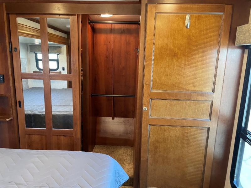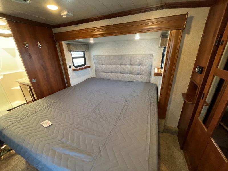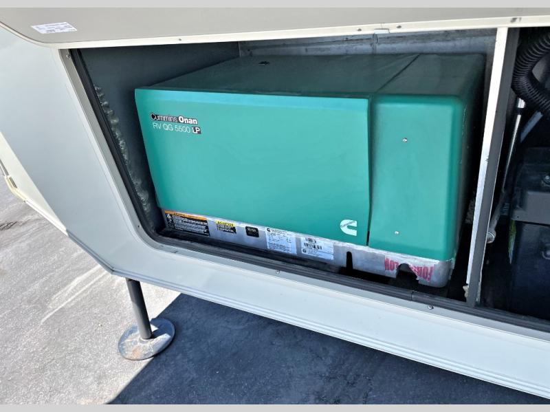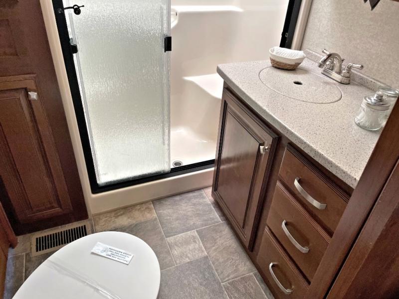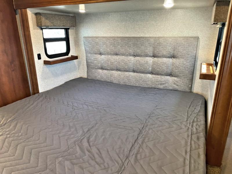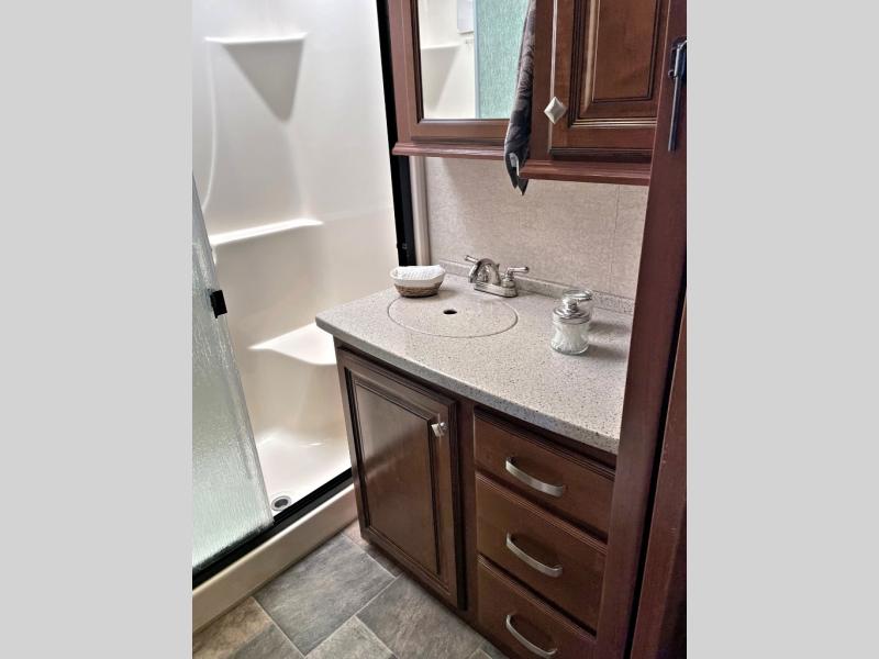 Head up the steps to the right of the main entry door and find a complete bath with shower including a seat, and a vanity with sink. There is also storage for linens and a toilet. There is a second sliding door in the bath that leads right into the front master bedroom where you will find a comfortable king size bed slide out, a dresser opposite along the curb side wall, and a front wall closet with sliding doors. For added convenience there is a washer/dryer prepped space so you can easily add the appliances, and so much more!