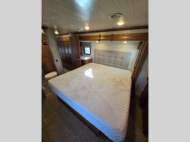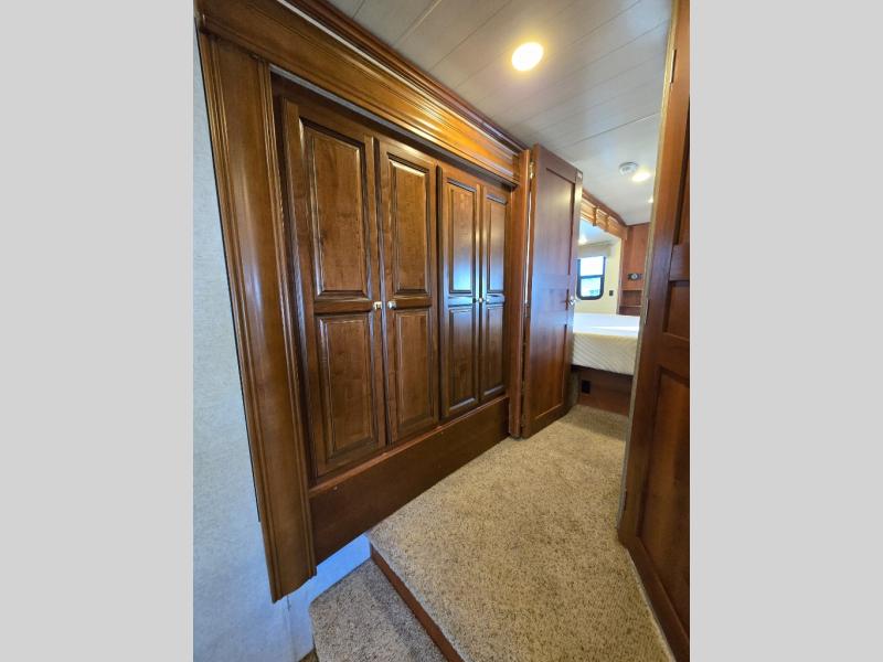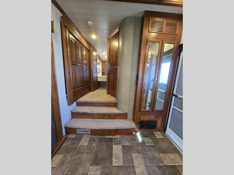There is a handy closet just inside the door on your right before you head up the stairs to the front bedroom and bath. As you get to the top step you will notice hall storage on the left that is part of the bedroom slide out which also features a nice size nightstand, and a king size bed.
