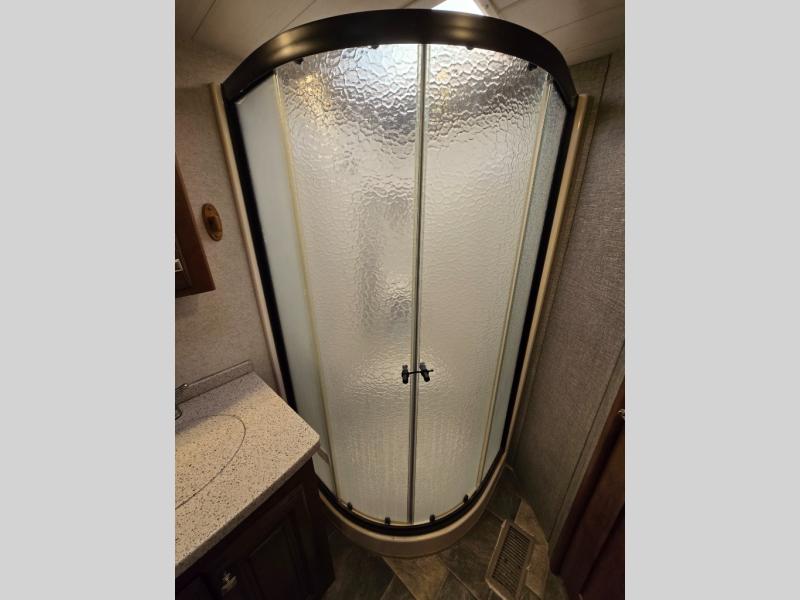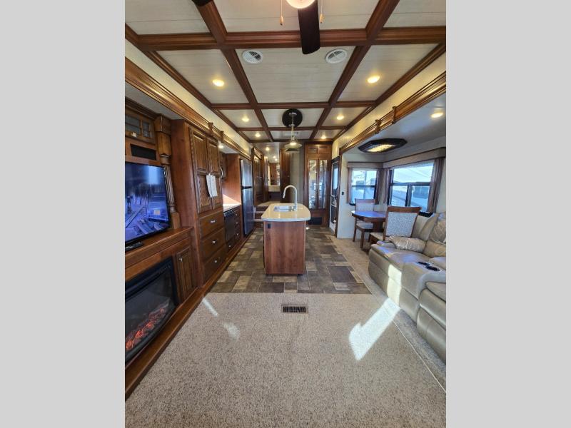 There is a dining table with chairs and two recliners located in the slide just to the left of the entry door. Both provide overhead storage, plus there is hidden storage under the dinette chair cushions. Along the rear wall you will find a sofa with end tables including storage above the entire width of the fifth wheel. The overhead cabinets have decorative glass inserts.