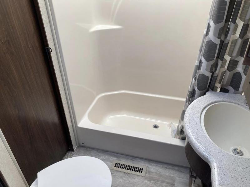 Step up to the side aisle bath including a shower, toilet, and sink. Pass all the way through with a convenient second door to the front master bedroom which features a king bed with storage on either side. There is also a slide out linen cabinet, and wardrobe with drawers and counter area.