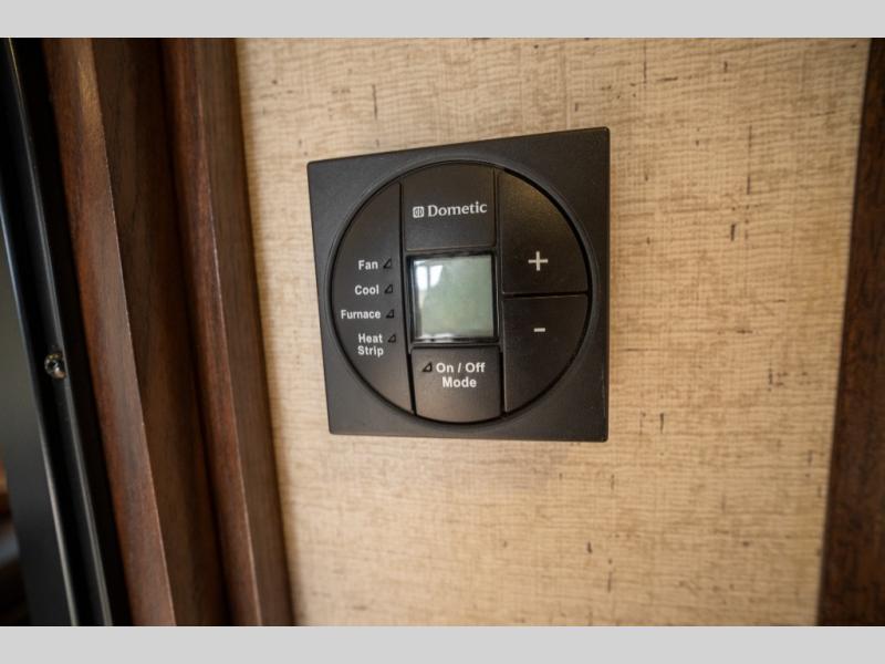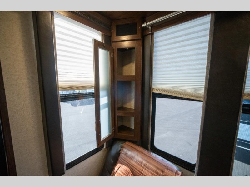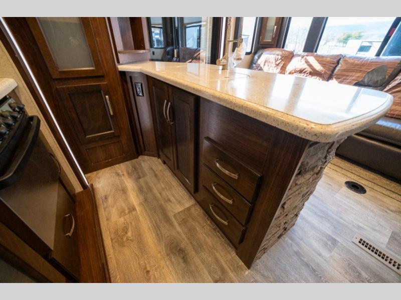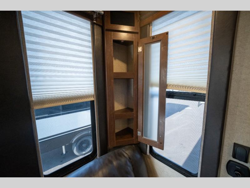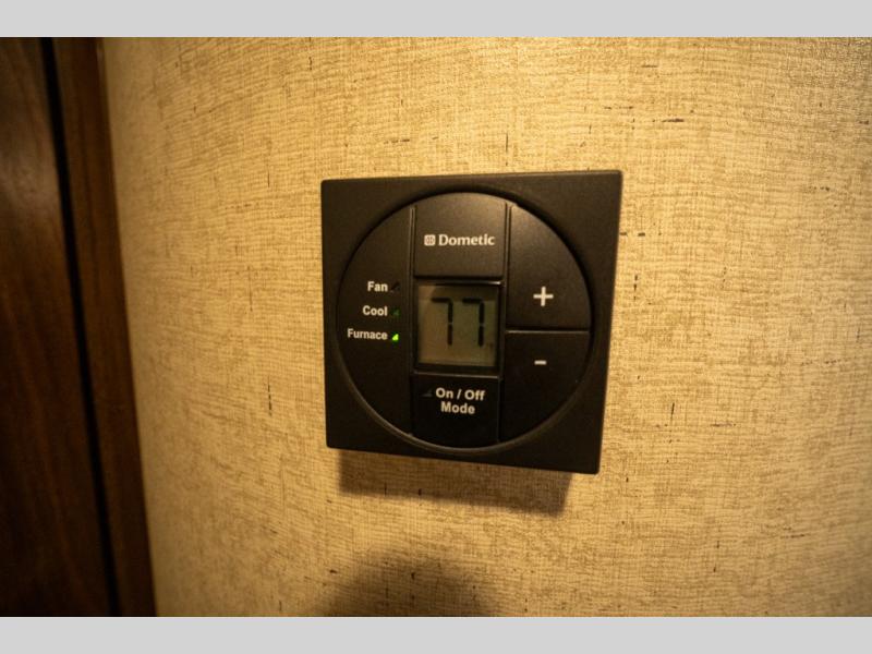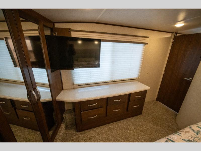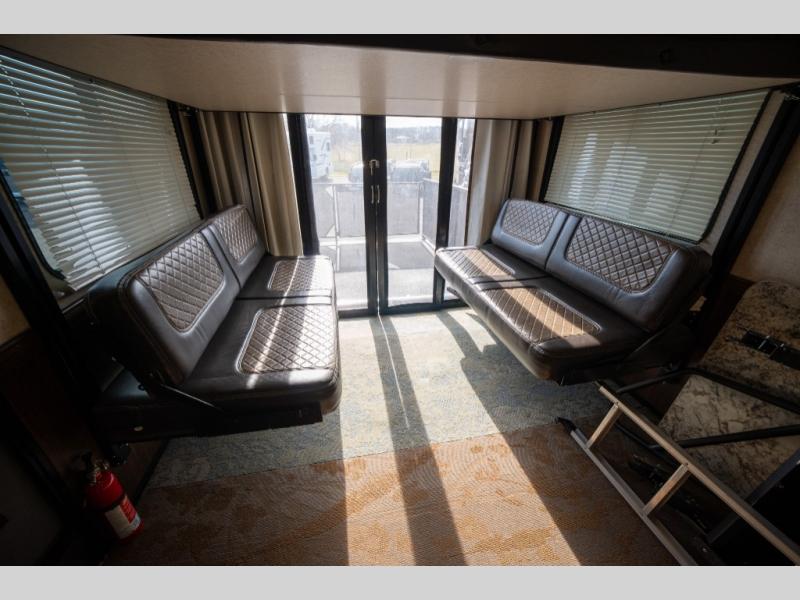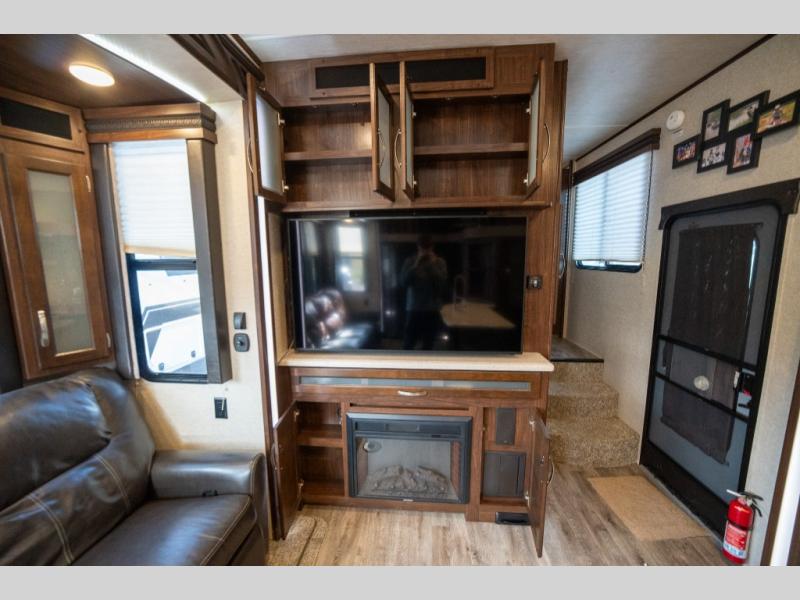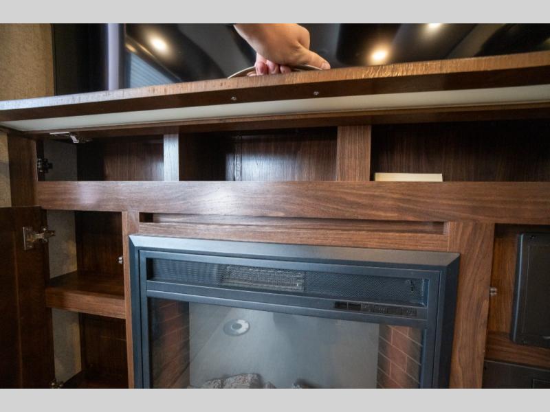 Opposite in the main living space find a large slide out sofa with two tables for meal time use. Enjoy the entertainment center nearby with a flat screen TV and storage both above and below. You can also find an electric fireplace if you want to add a warm glow to your evenings indoors.