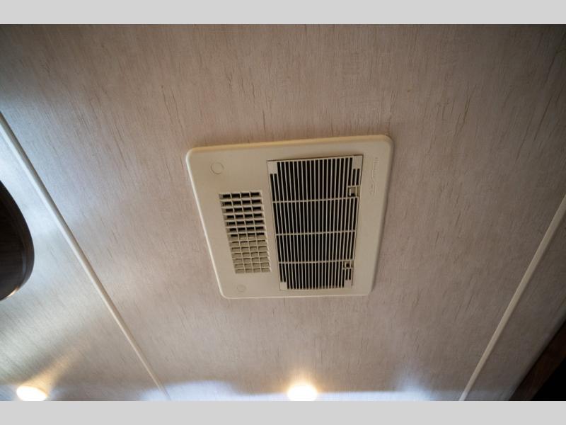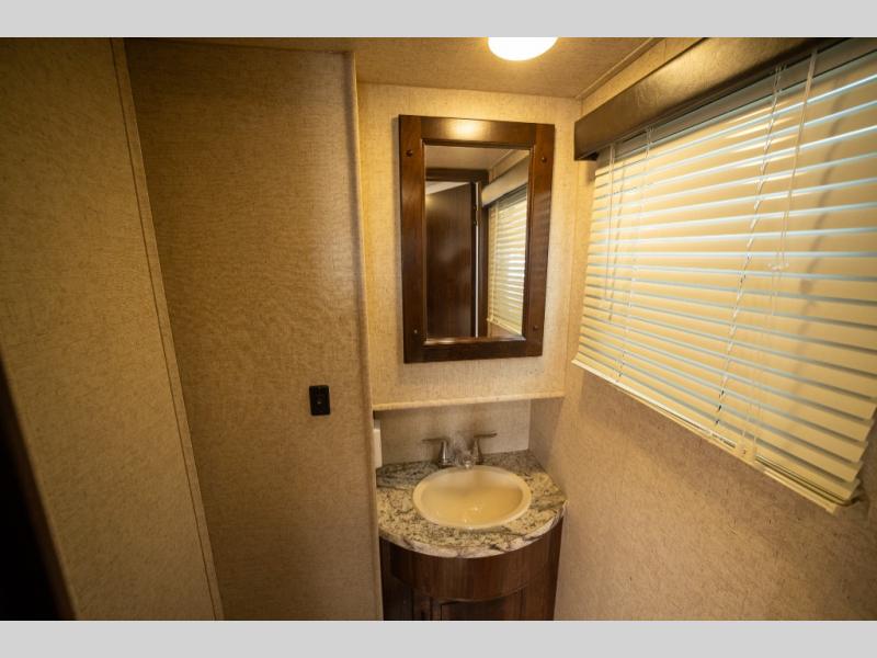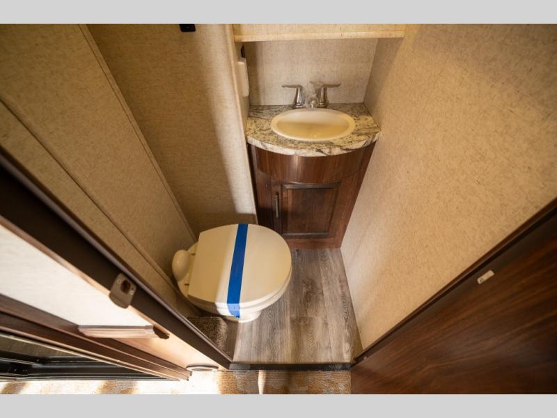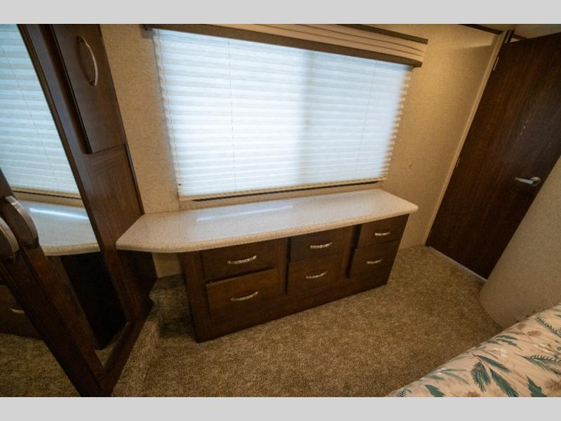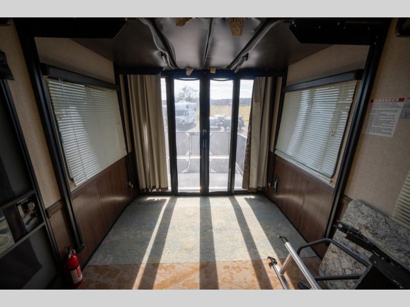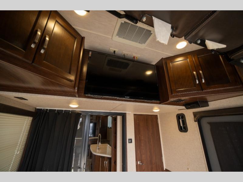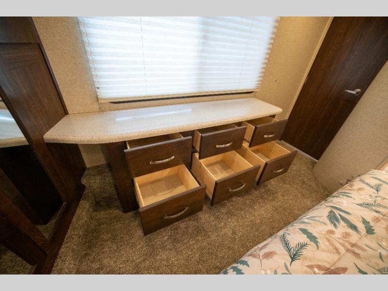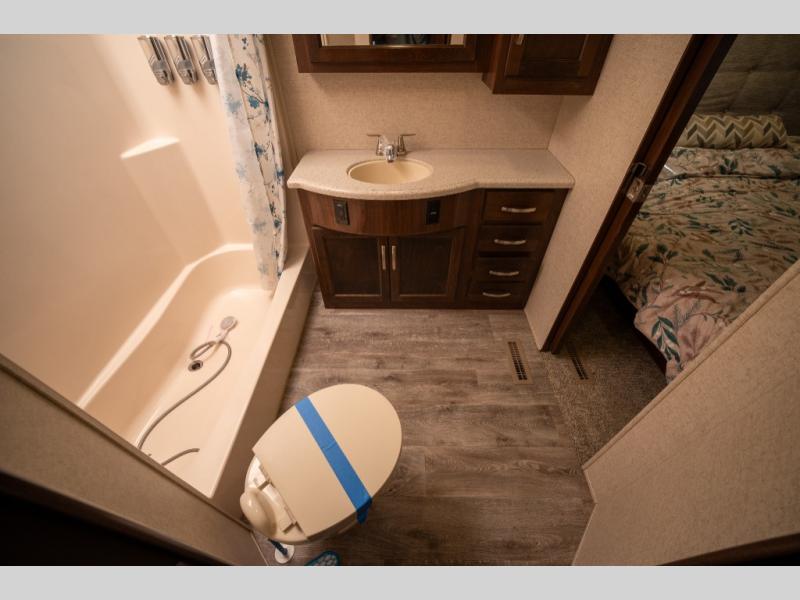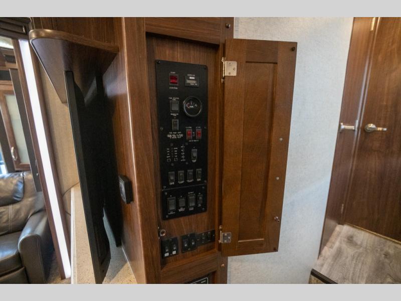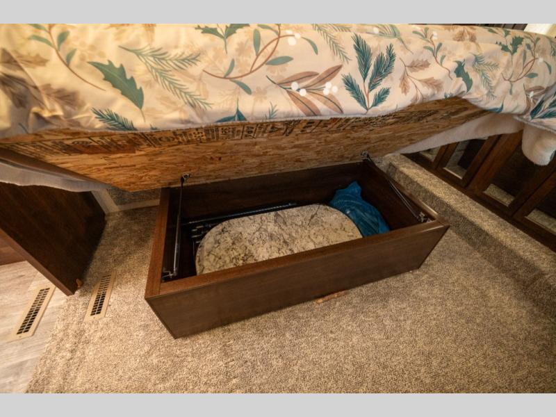 Opposite in the main living space find a large slide out sofa with two tables for meal time use. Enjoy the entertainment center nearby with a flat screen TV and storage both above and below. You can also find an electric fireplace if you want to add a warm glow to your evenings indoors.