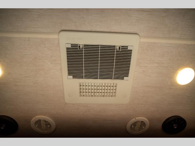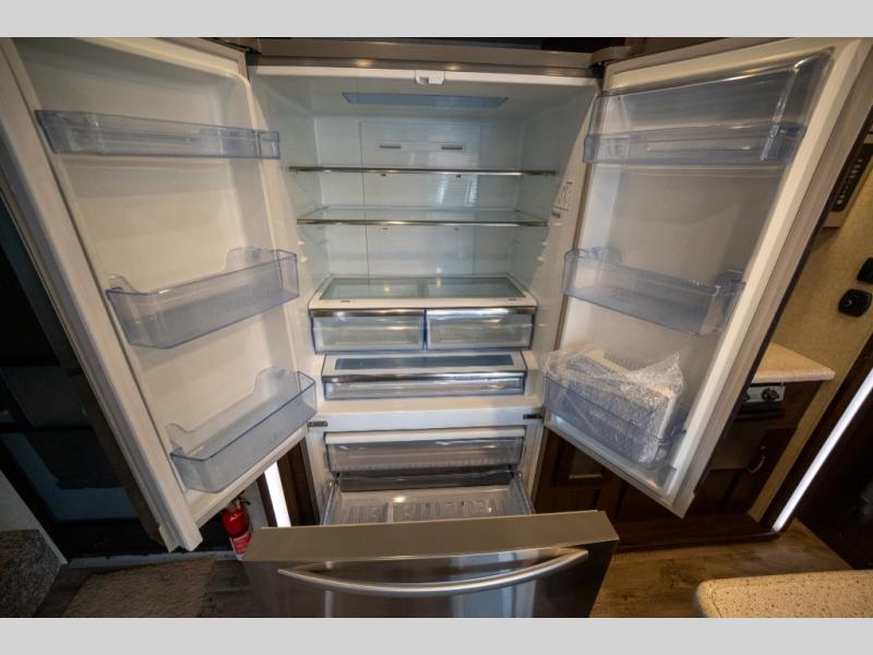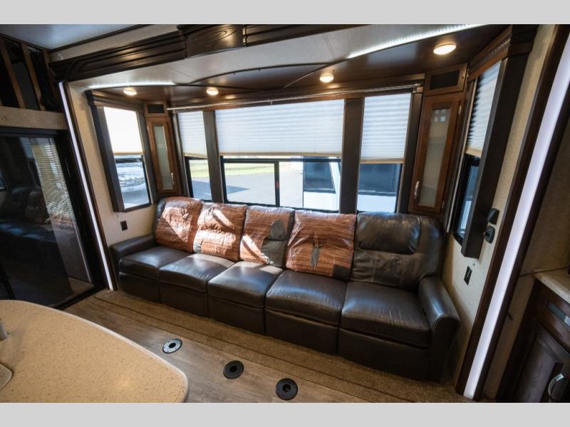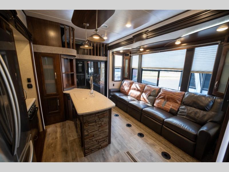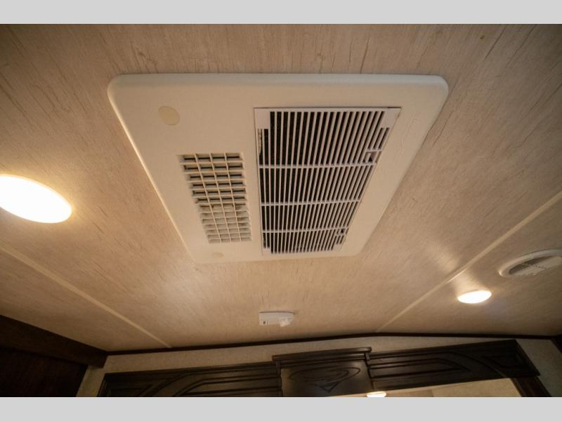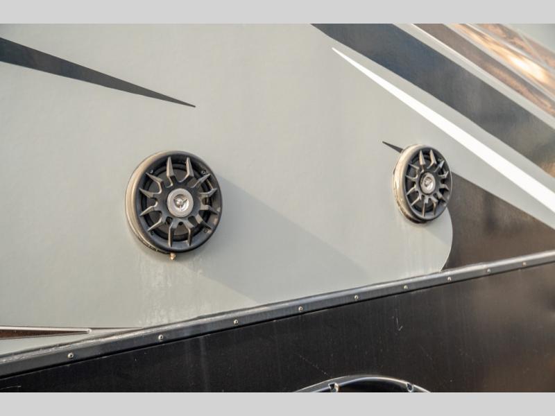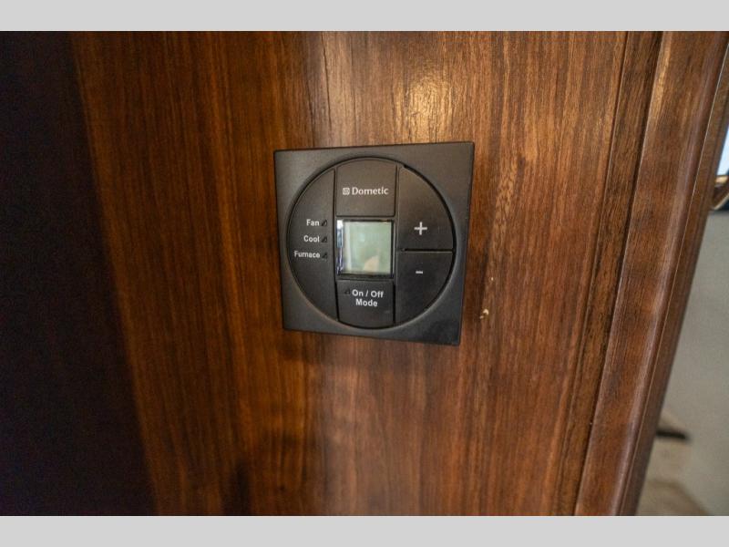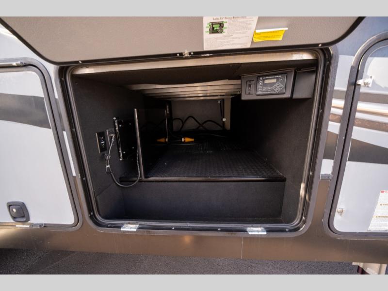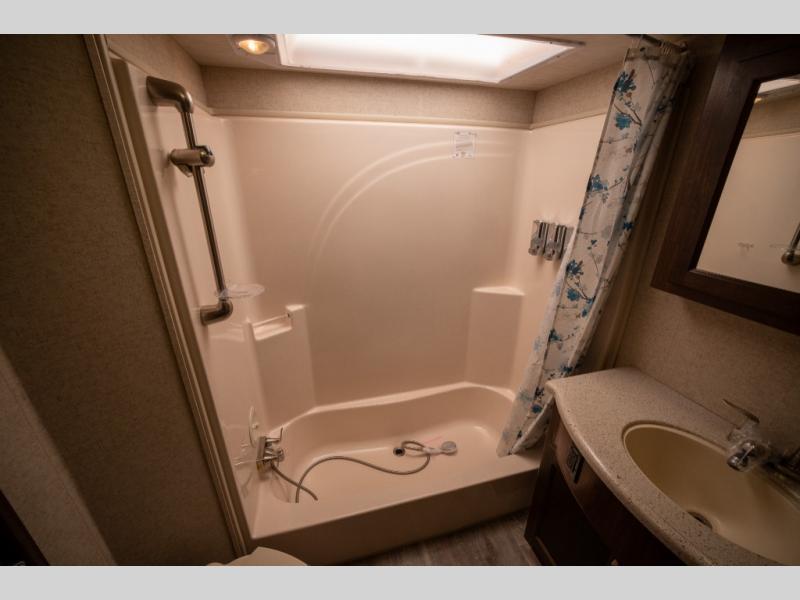Opposite in the main living space find a large slide out sofa with two tables for meal time use. Enjoy the entertainment center nearby with a flat screen TV and storage both above and below. You can also find an electric fireplace if you want to add a warm glow to your evenings indoors.