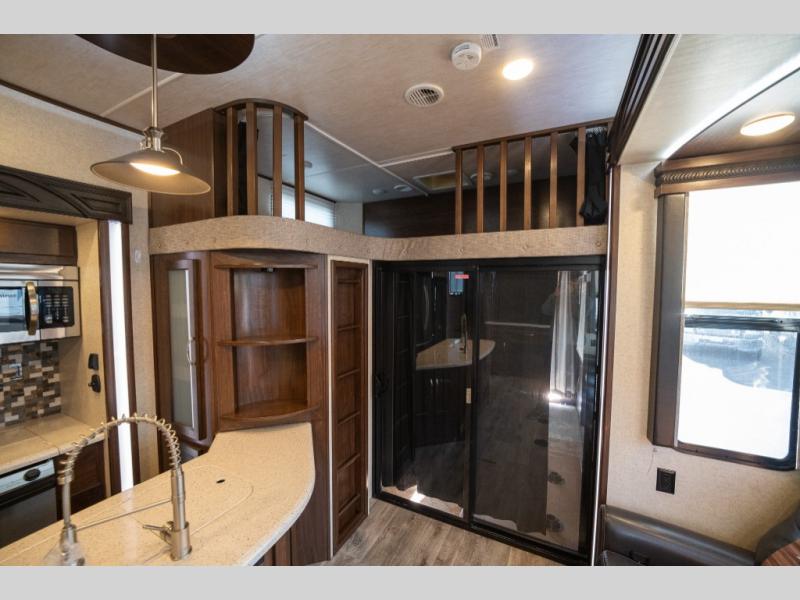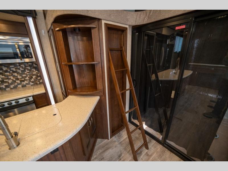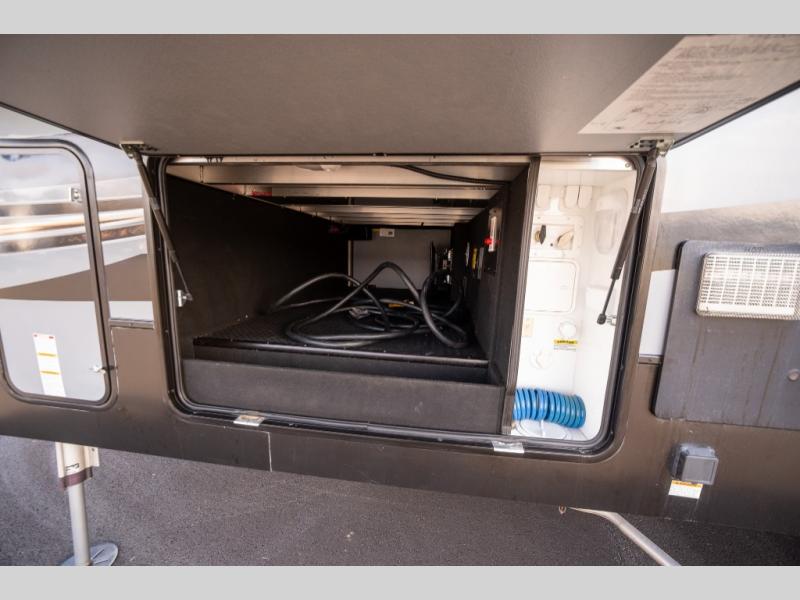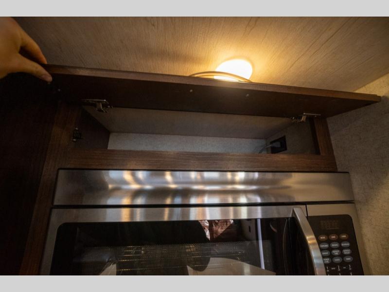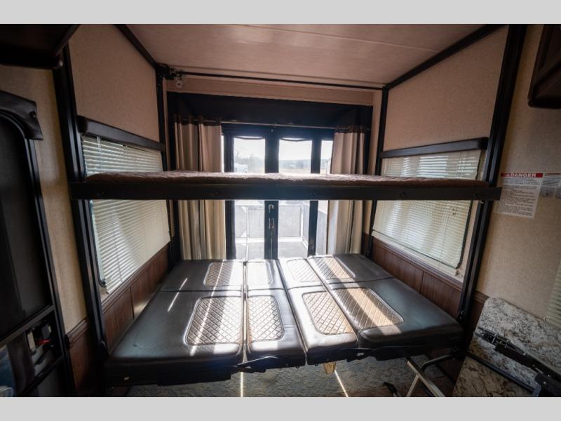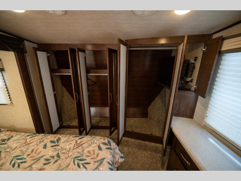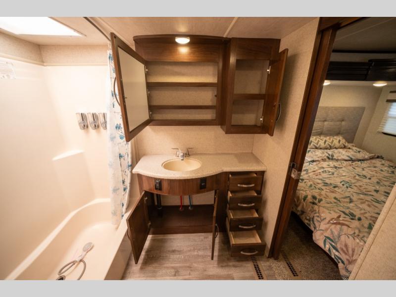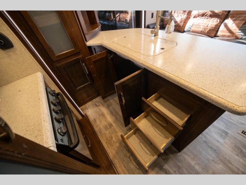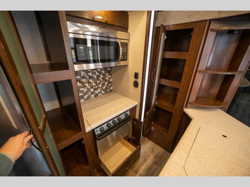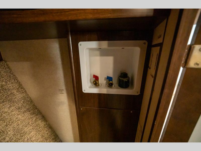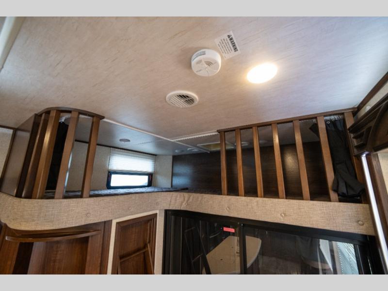 Step inside and enjoy the wide open feel with dual opposing slides in the main living area. There is a slide out to the left of the door featuring a refrigerator, counter space, and a three burner range with microwave overhead. There is an additional storage cabinet just off the slide before the counter peninsula that includes a double kitchen sink. Above the counter on the wall you will find open corner shelving. Just around the corner there is a ladder that leads to the loft that overlooks the floor with sleeping for two.