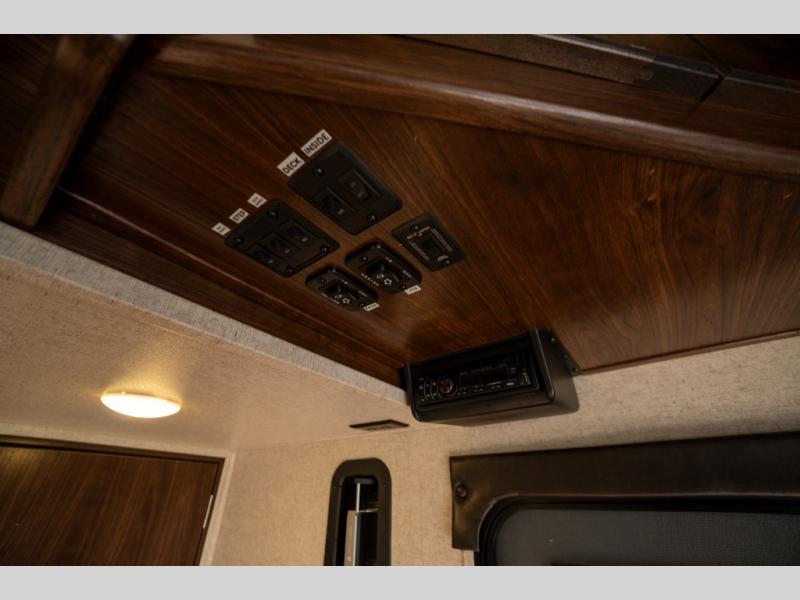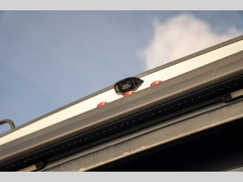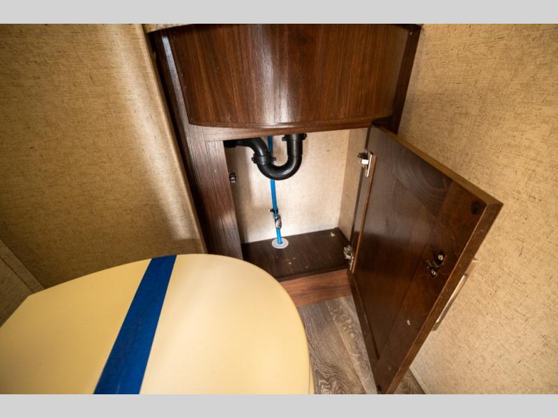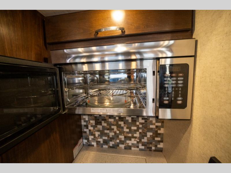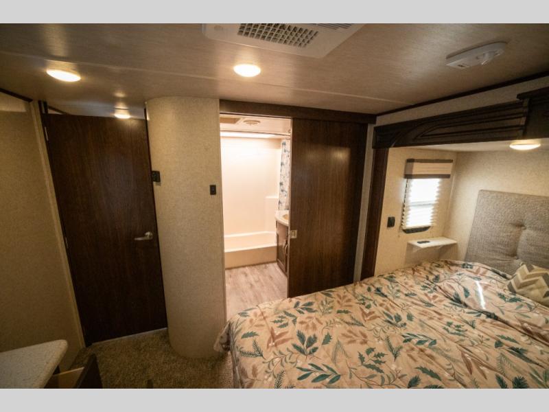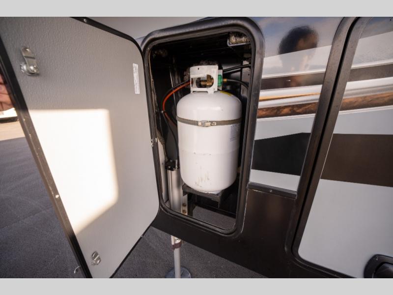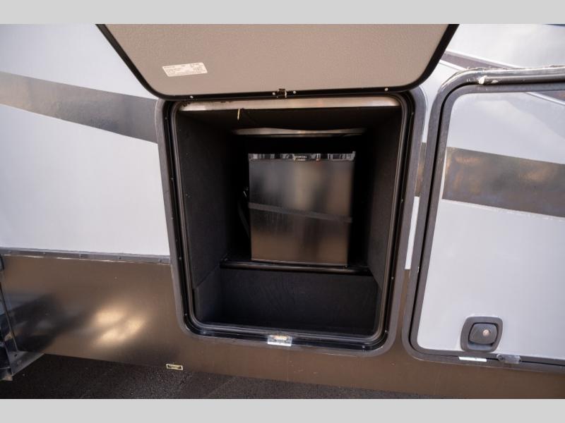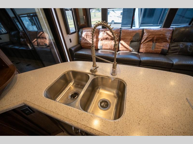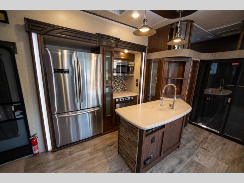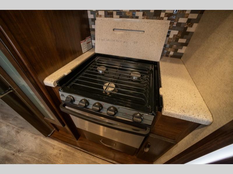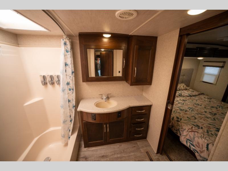 Step inside and enjoy the wide open feel with dual opposing slides in the main living area. There is a slide out to the left of the door featuring a refrigerator, counter space, and a three burner range with microwave overhead. There is an additional storage cabinet just off the slide before the counter peninsula that includes a double kitchen sink. Above the counter on the wall you will find open corner shelving. Just around the corner there is a ladder that leads to the loft that overlooks the floor with sleeping for two.