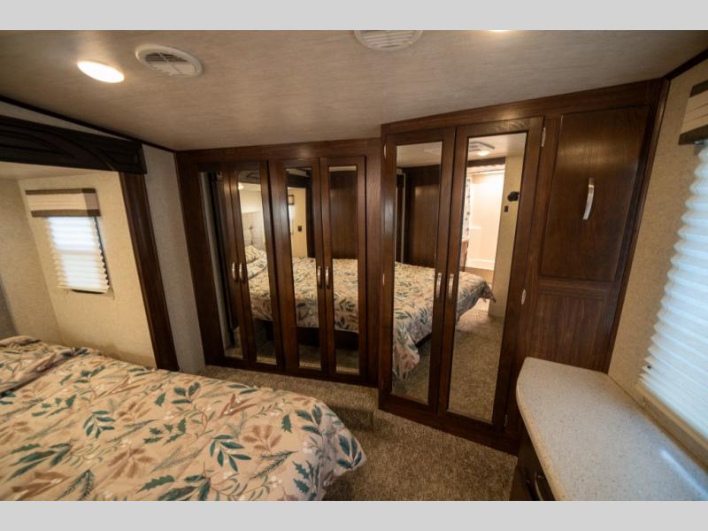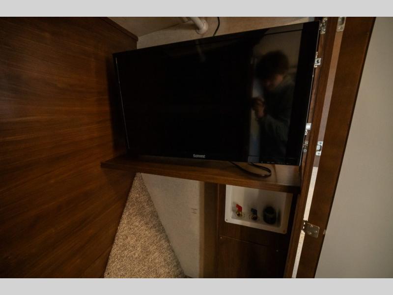 The master bedroom up front features a slide out king size bed with nightstand, a dresser along the opposite wall, and a wardrobe with sliding doors, plus a corner closet that has been prepped for a washer and dryer. There is even a TV on a swing arm that is stored in the cabinet