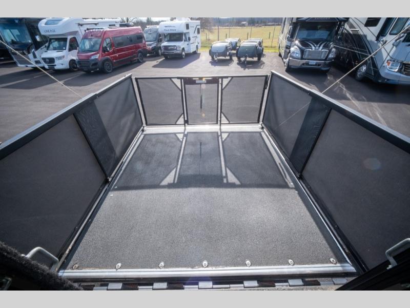 The rear 12' cargo garage will help you easily take along some toys. The rear 8' ramp door makes loading and unloading a snap. There is also a side man door for added convenience also. Inside find plenty of space for your toys, plus corner overhead cabinets, and a half bath. Plus you can add there is an electric queen bed with convertible sofas for extra guests, and so much more!
