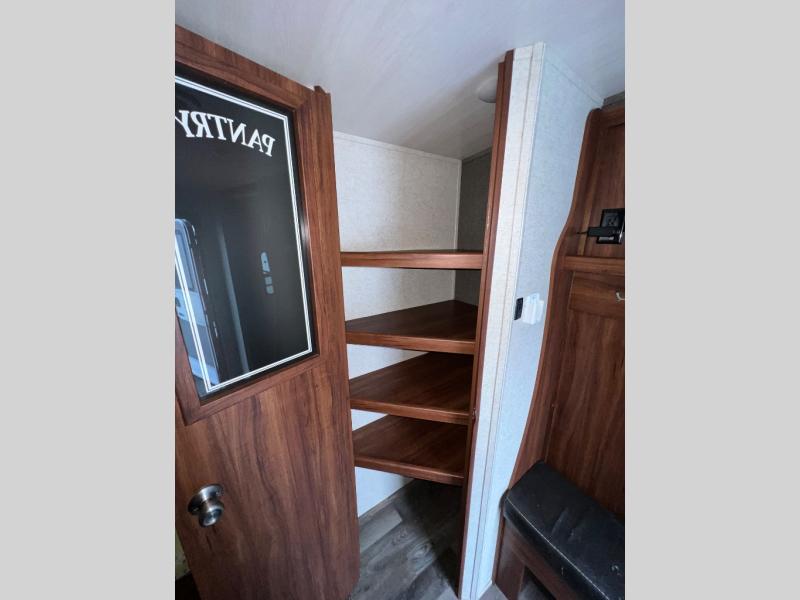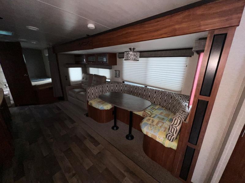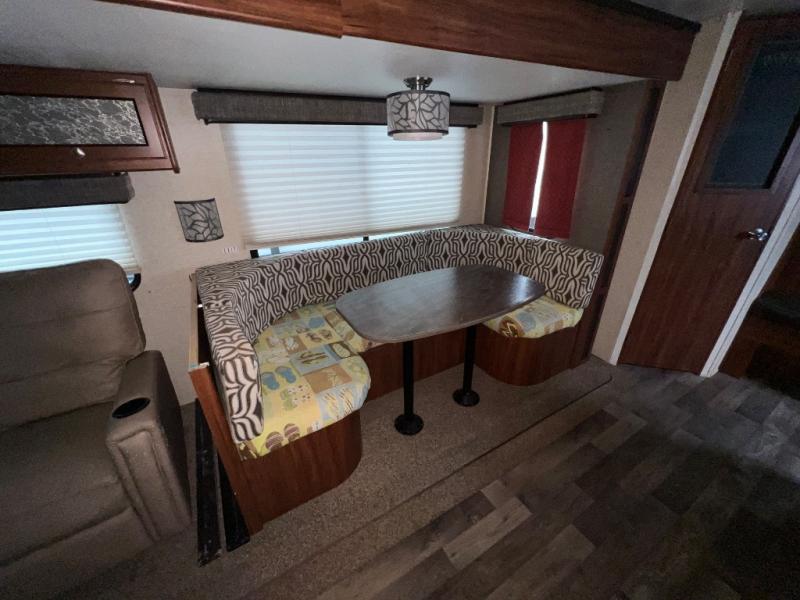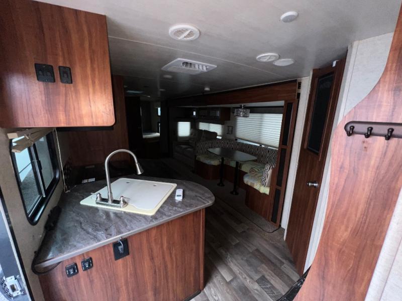 Enter through the front entry door, and you will find yourself in the combined living and kitchen area. Along the door side there is an angled double sink, a three burner range, an overhead cabinet, and a refrigerator. Next to the refrigerator you will find an entertainment center. Along the roadside the slide out features a u-shaped dinette and a sofa. Near the slide out there are a few different storage areas.