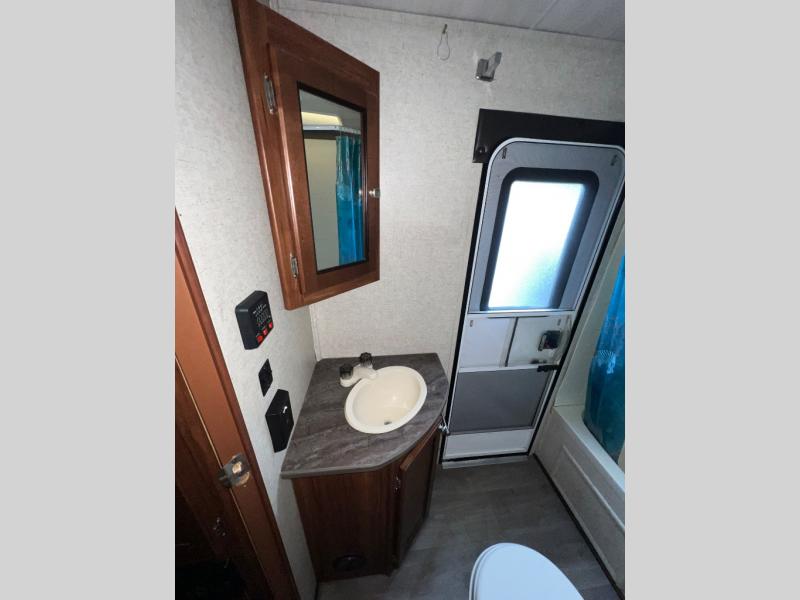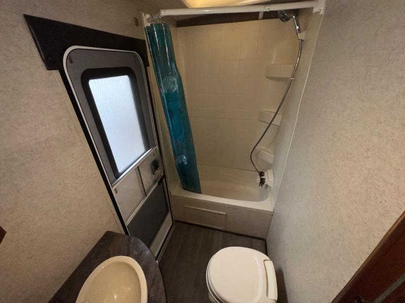 In the left rear corner of the trailer there is a bathroom with a sink, medicine cabinet, toilet, and a shower. You will also find a convenient door which leads outside.