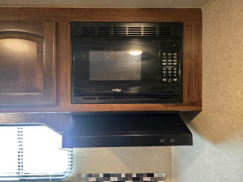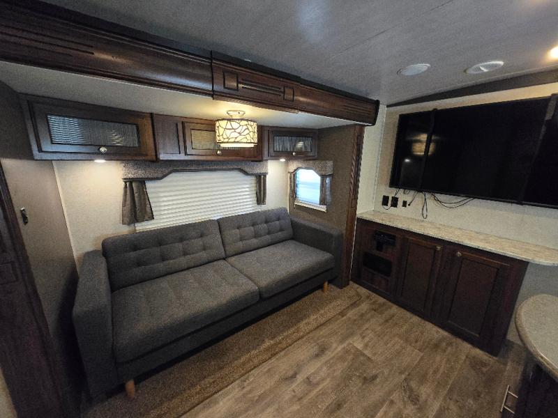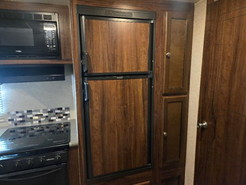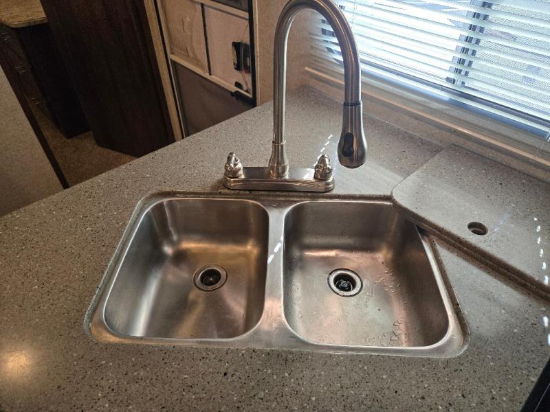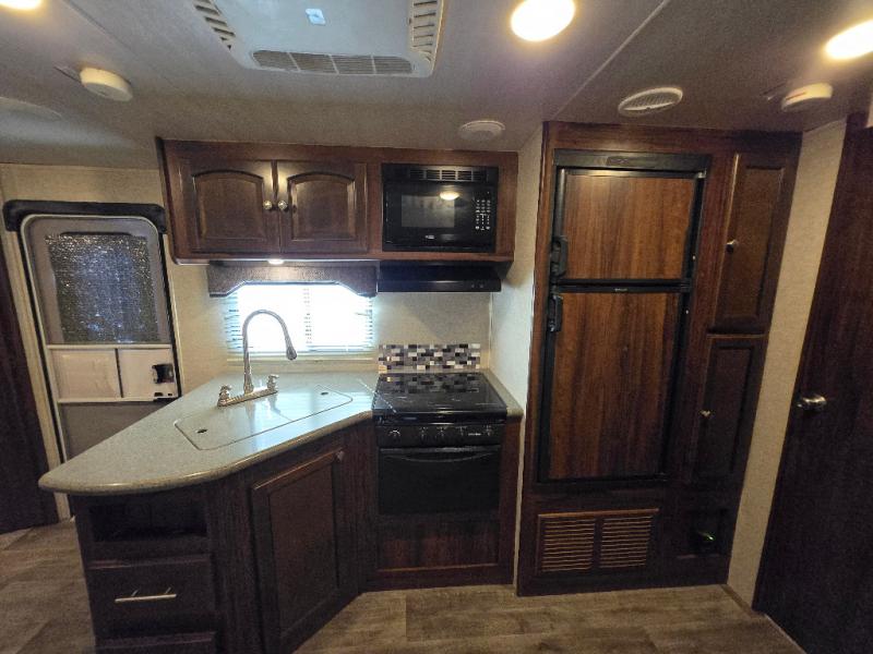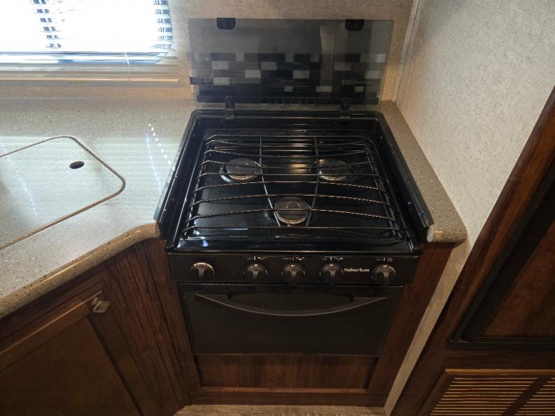 As you enter model 26BRLS you will find a combined kitchen and living area straight ahead. The kitchen is to your immediate left with a double sink set in an angled counter. There is a three burner range, refrigerator, and pantry for food storage needs. You will also find ample overhead storage for your daily dishes and other kitchen items.