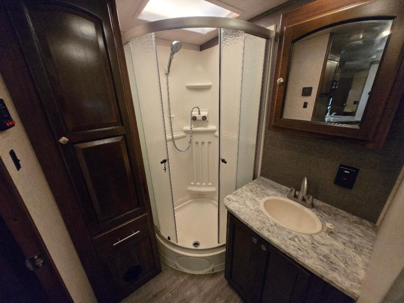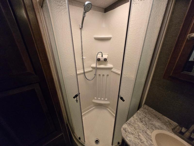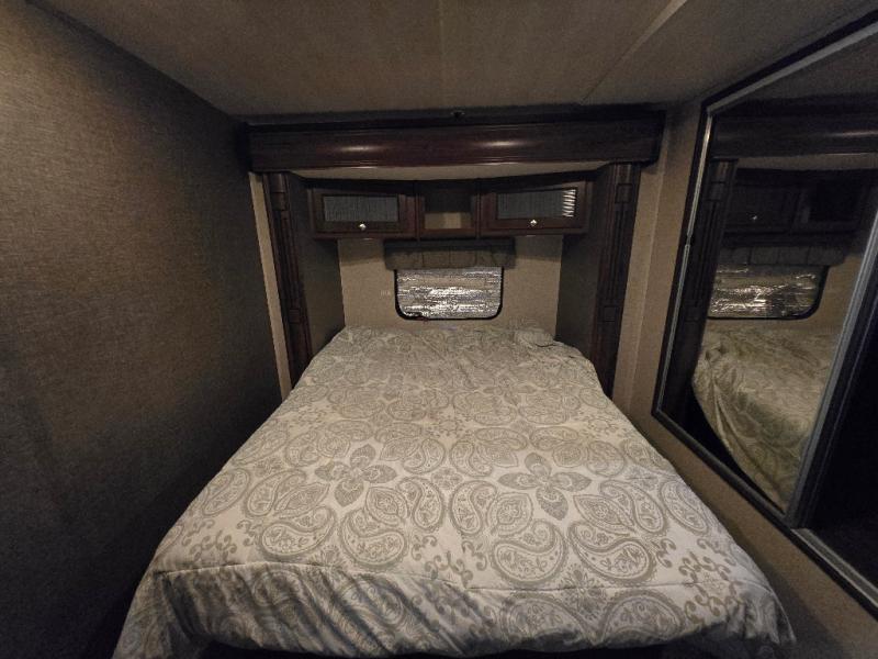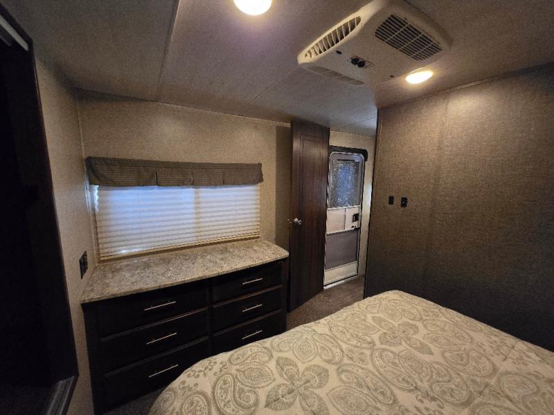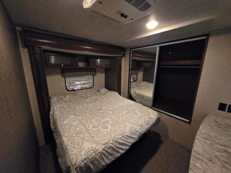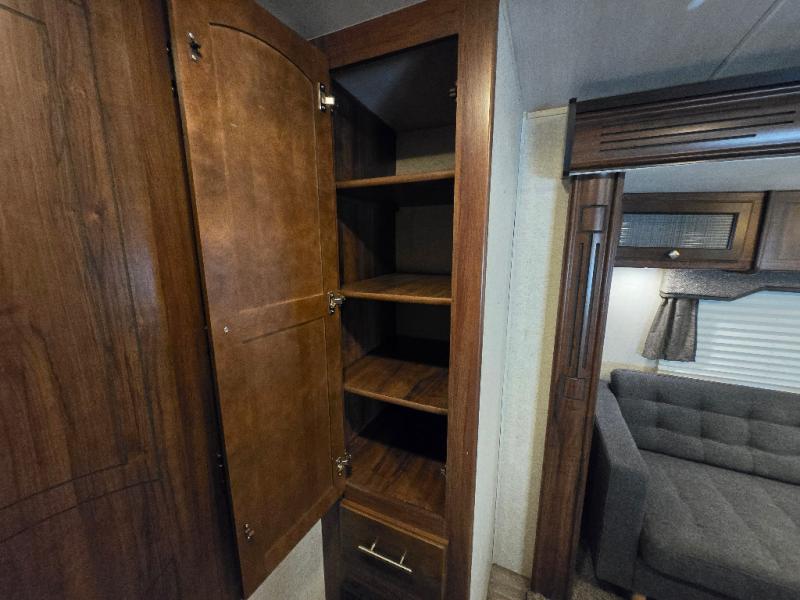 To the right of the entry door you will find a front bedroom including a slide out queen size bed. There is a dresser opposite along the curb side wall, and a large full front closet with sliding doors for your clothing.