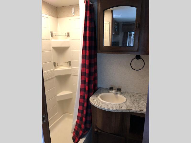 The bath features a tub/shower, toilet, and a sink. There is also an entertainment center with storage along the opposite wall of the bath near the dinette slide. You can add an optional TV if you like.