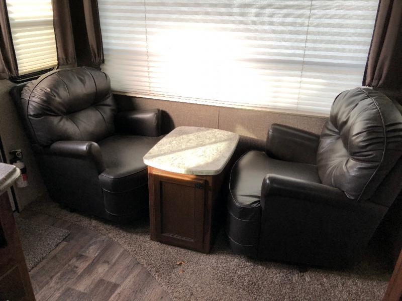 Step inside the main entry door and notice the swivel rockers inside along the rear back wall. There is an end table between for drinks and keys, plus a full width row of overhead cabinets for storage.