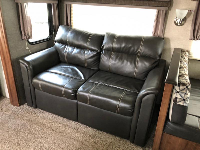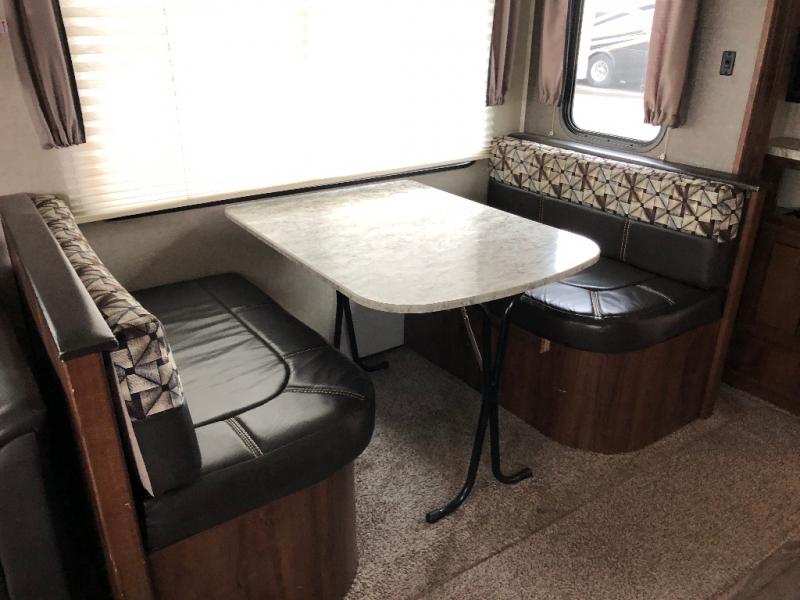 As you continue moving through this unit you will see a slide out sofa with overhead storage and booth dinette. The perfect place to enjoy meal time, board games, or just hanging out.