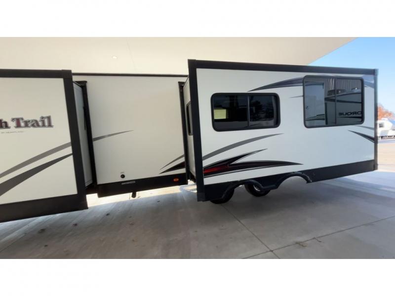Camping from your own home is what it will feel like in this North Trail King slide travel trailer by Heartland RV. Model 30RKDD features a spacious rear kitchen, two slide outs for added moving about space, and many conveniences that will make your camping time enjoyable!