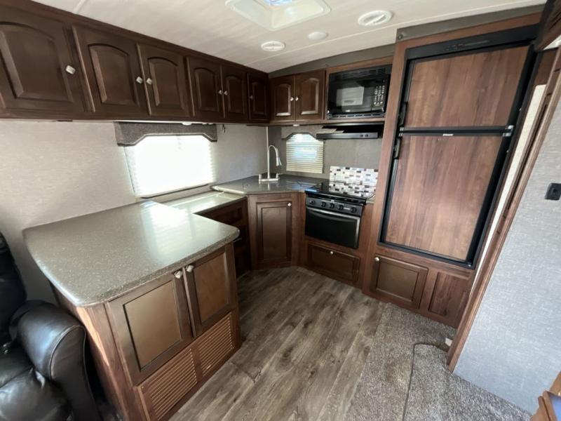 Prepare and cook food for your family easily on the go in this North Trail 30RKDD rear kitchen featuring plenty of counter space and overhead storage along the rear and curb side wall including a small L-shaped countertop. There is a double sink, three burner range, and refrigerator also.
