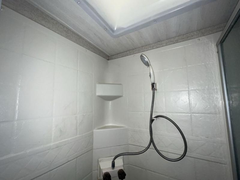 At the head of the hall in front find a welcome retreat in the bedroom with a queen size bed, overhead storage, nightstand, and bedside wardrobe, plus a wardrobe slide out.