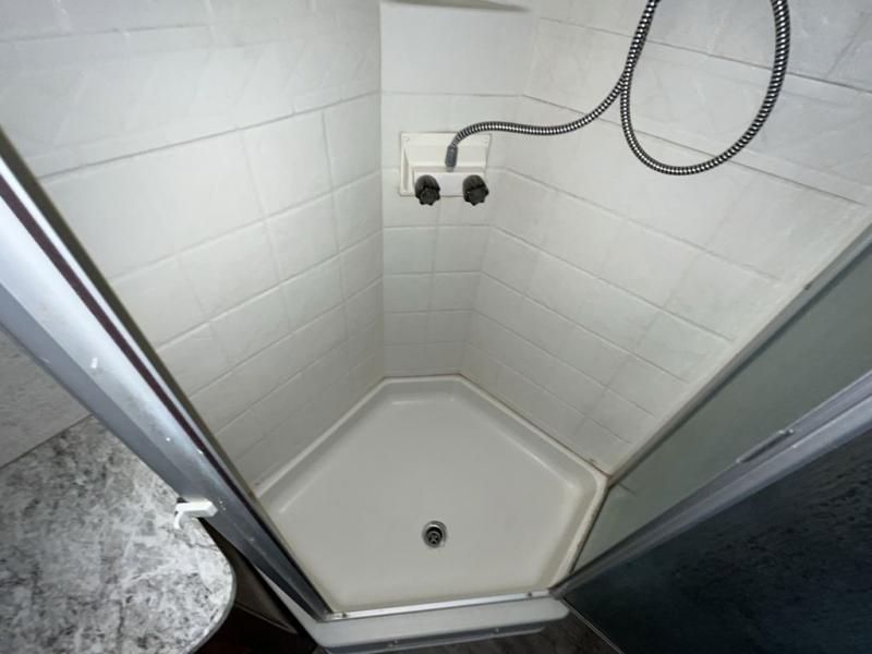 Back to the main living space you will see how open it feels with the large slide out u-dinette and sofa including overhead cabinet. There is an entertainment center along the interior wall that you can add an optional flat screen TV which can be easily viewed from any seating in the room.