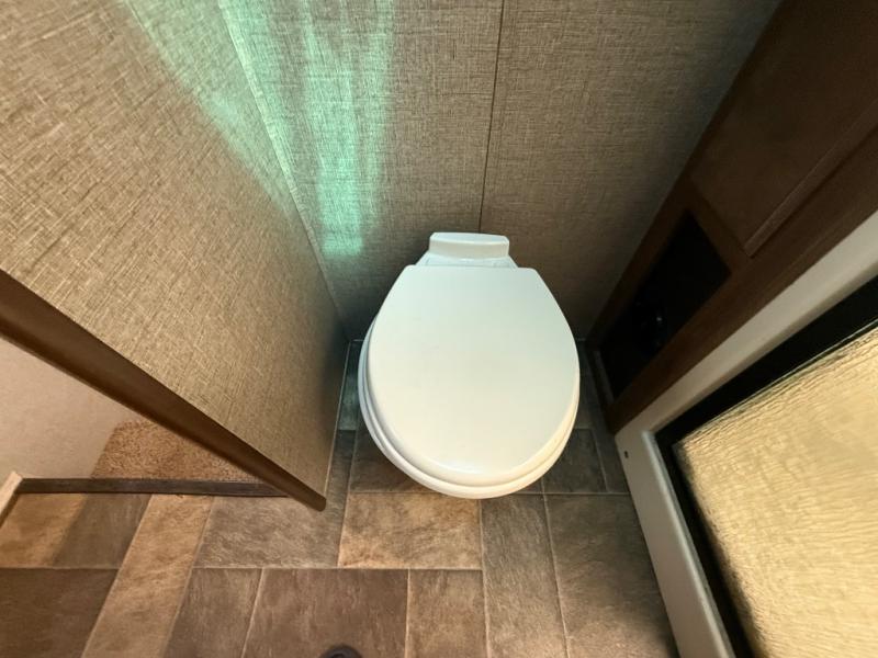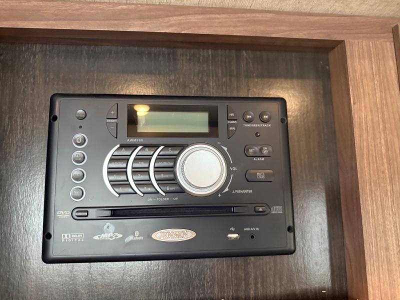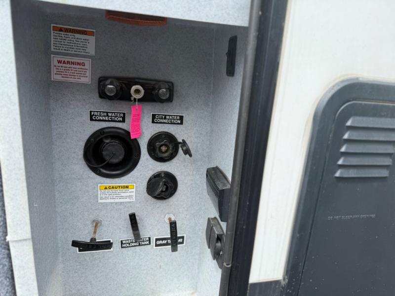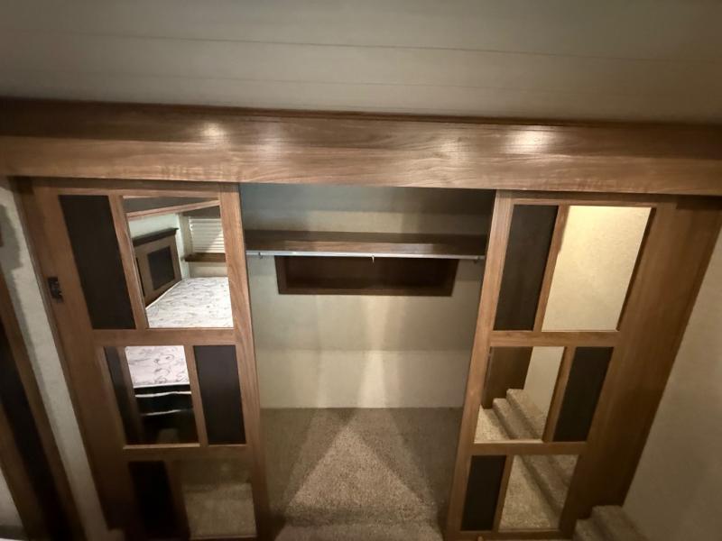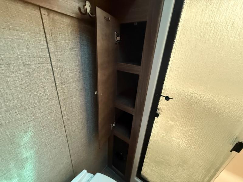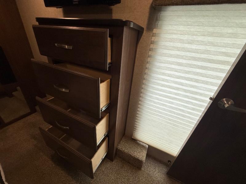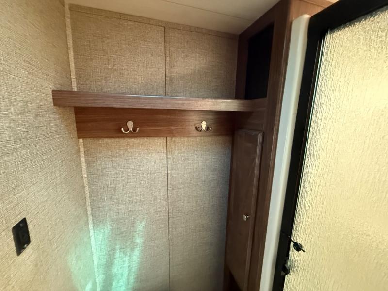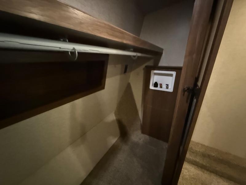 At the head of the hall there is a door to the front private bedroom. Here you will enjoy a little time away from the hustle and bustle of the main living area. The queen bed slides out and features storage overhead, plus there is a full front wall wardrobe for your clothes. One side of the wardrobe/closet has been prepped with a washer and dryer so you can arrive back home with all of your laundry done! You will also find a dresser along the curbside wall for added storage space, plus so much more!