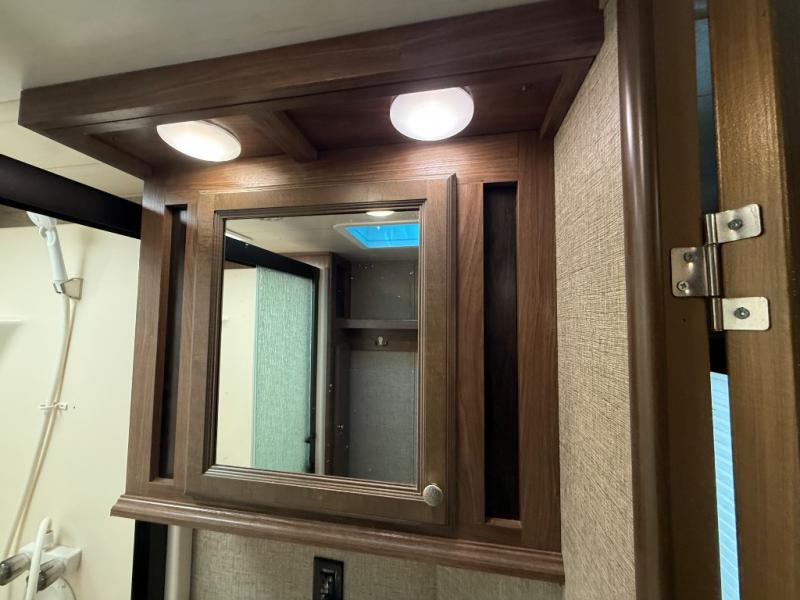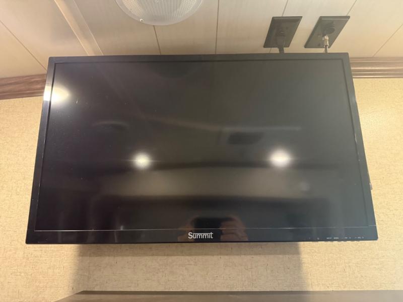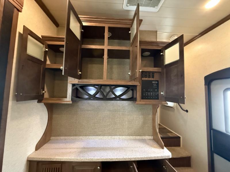 The slide opposite the curbside features a dining table with four chairs, and two recliners. Adjacent, along the rear wall enjoy a comfortable sofa with end tables. An entertainment area along the interior wall features an LED TV for enjoyment.
