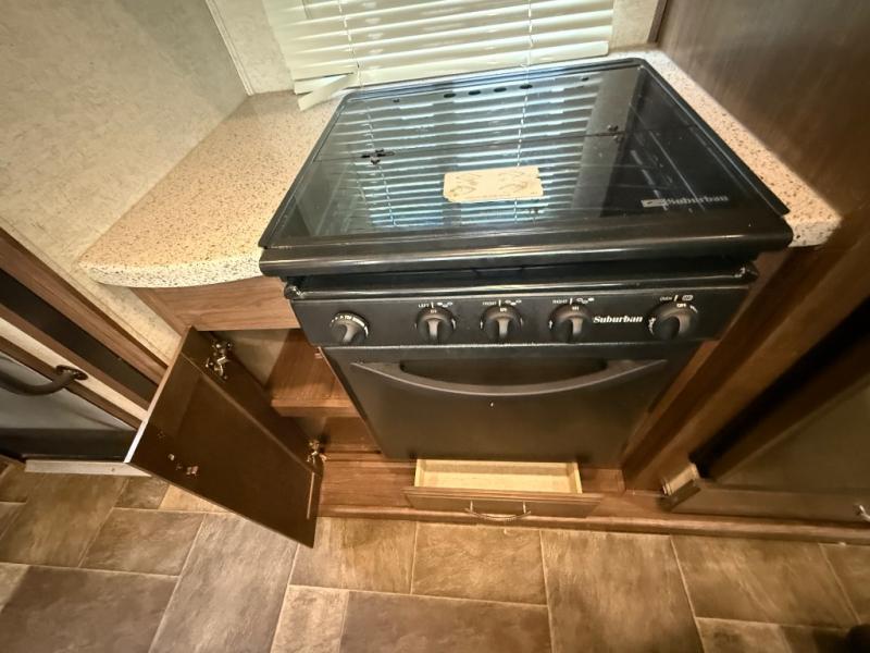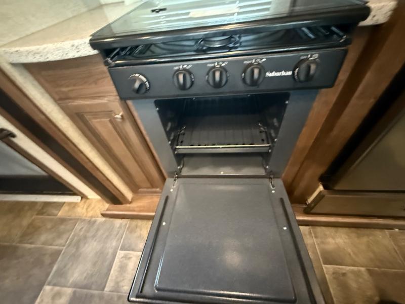 Step inside model 304RL and notice the wide open living space to the left of the door. There is a slide out three burner range, a large counter area, plus a residential refrigerator for your perishables. The island counter offers even more space, plus a double sink which allows you to face some of the seating areas and take part in the conversation even when you are doing the dishes and preparing food.