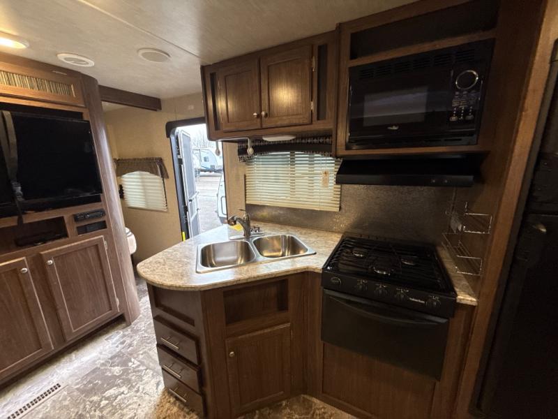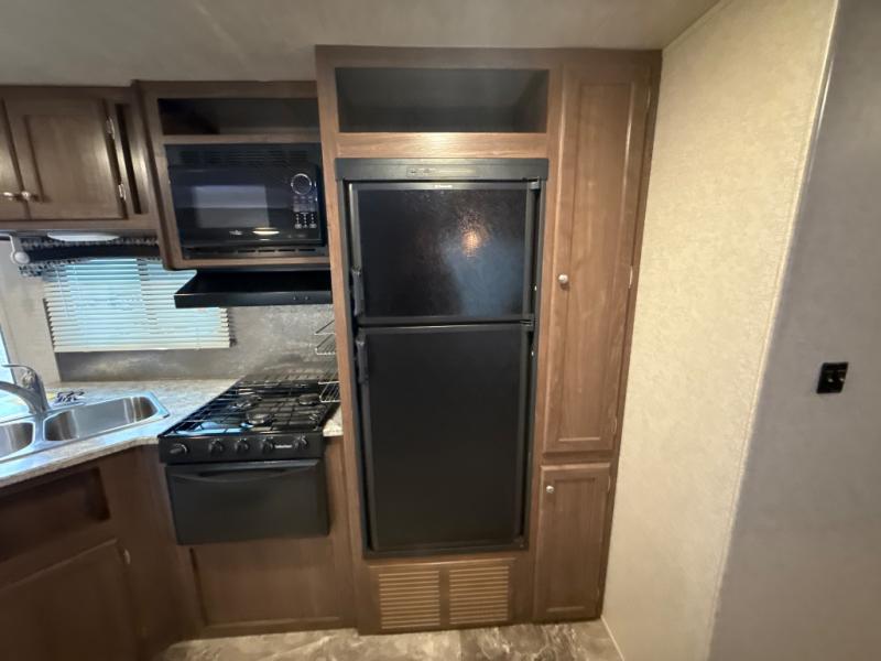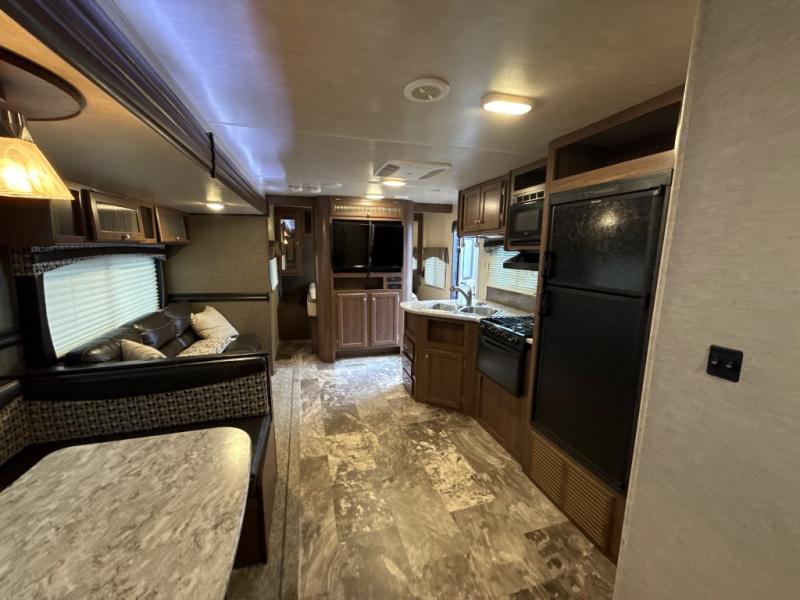 As you step inside this travel trailer you will appreciate how open an spacious this model feels. Along the road side there is a slide out with a sofa, an overhead cabinet, and a u-shaped dinette. The kitchen amenities are located along the door side. Here you will find a double sink, a three burner range, an overhead cabinet for your dishes, a refrigerator, plus a pantry for your canned goods. There is also an entertainment center near the entry door.