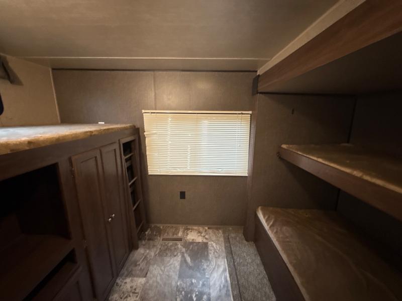 The rear bunk house features a slide out with a sofa and a bunk above. Along the opposite side of the room there is an entertainment center where you can place a TV, a wardrobe for your hang up clothes, and an upper bunk, plus so much more!
