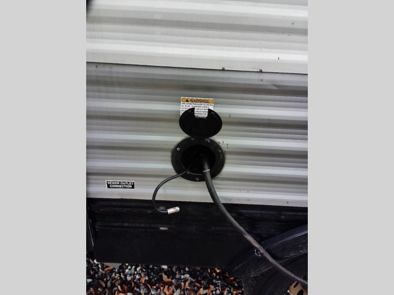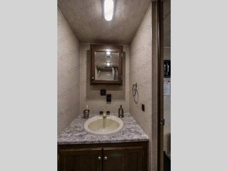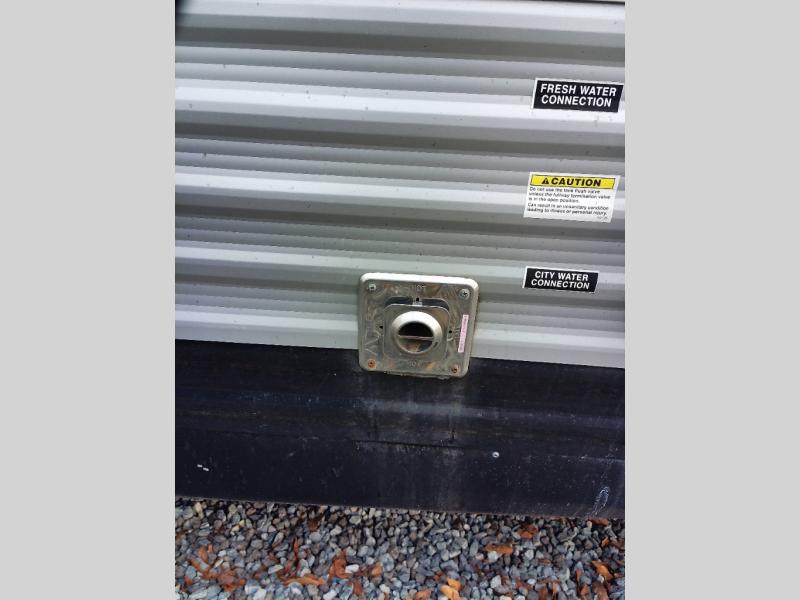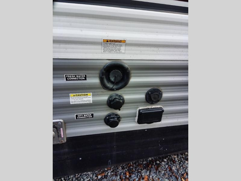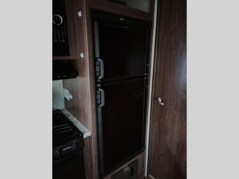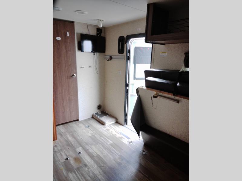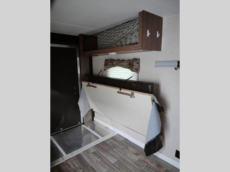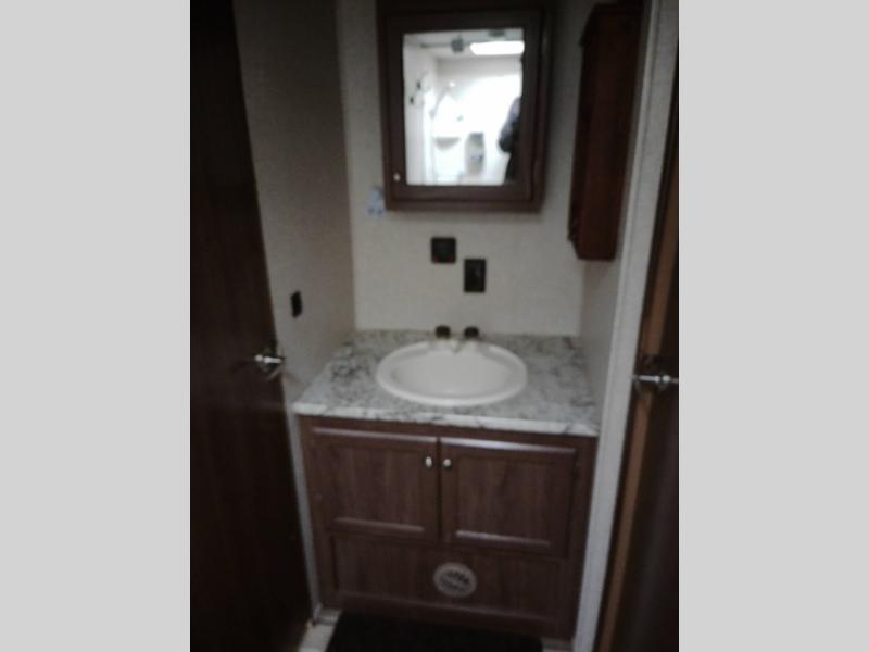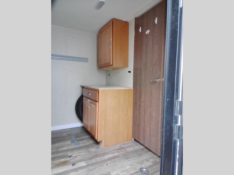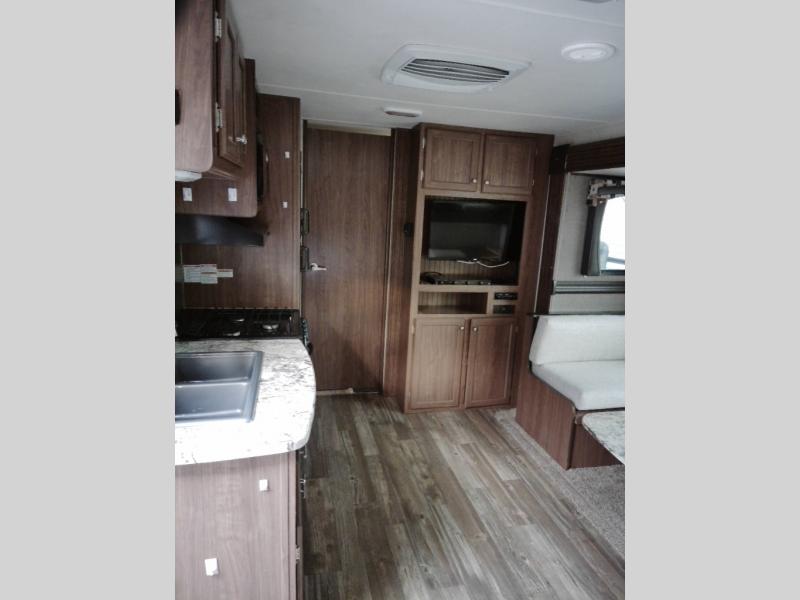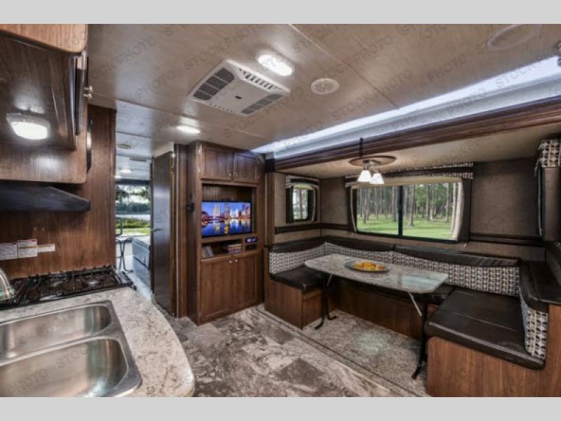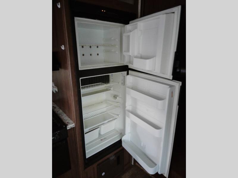The main living area has a single slide out which helps to maximize the floor space. Within the slide out there is a u-shaped dinette where you can enjoy your meals during the day, and at night you can use this area for additional sleeping space. Along the interior wall you can add a TV if you so choose. The kitchen area features a double sink, a three burner range, overhead cabinets for your dishes, and a refrigerator.