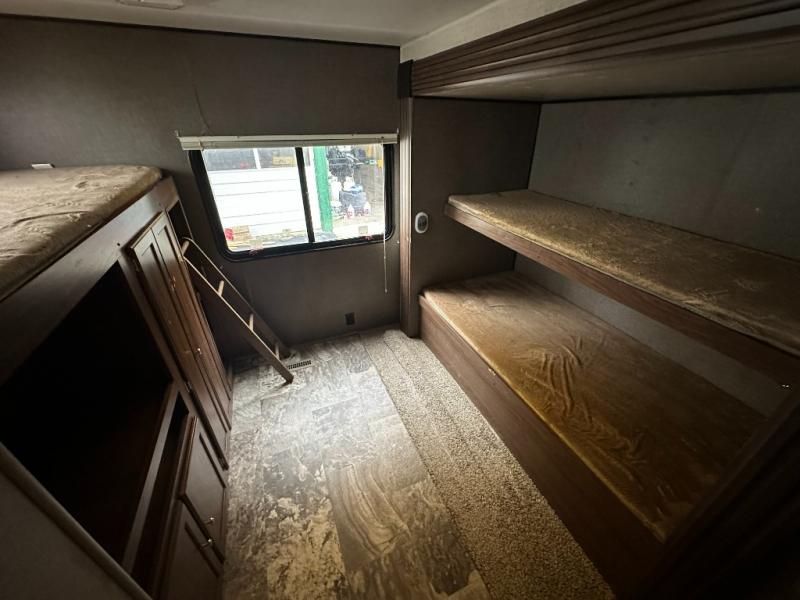 BUNK ROOMStep inside the entry door furthest to the front. There is a queen bed master with dual sliding doors to create privacy just off the entertainment center. Along either side you will find nightstands and overhead shirt closets, along with additional storage above the head of the bed.
