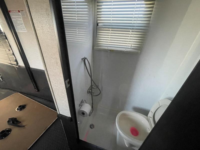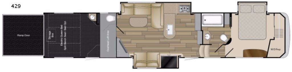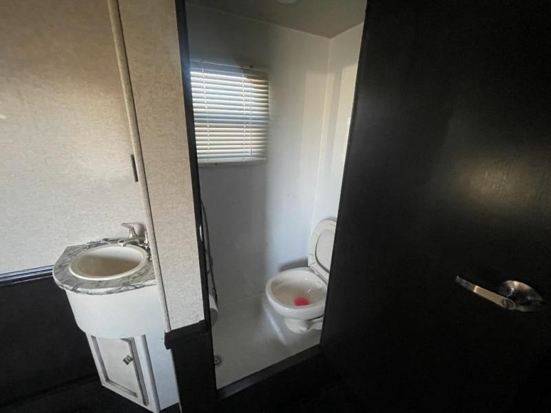 Load up easily for your next adventure using the rear ramp door. Inside notice the floor storage box for tools and things, and all of the space available for your toys. There are overhead cabinets in the front corners of the garage, and there is also an overhead loft. You will love the half bath in the cargo space so you don't have to track any evidence of a fun filled ride inside when you need to go! Once the toys are moved outside you can lower an electric queen bed with split bench seat/bed if you elected to add this option. This provides added seating and sleeping space for several individuals.