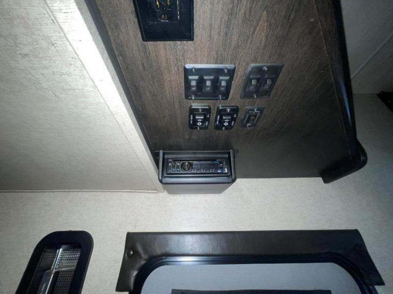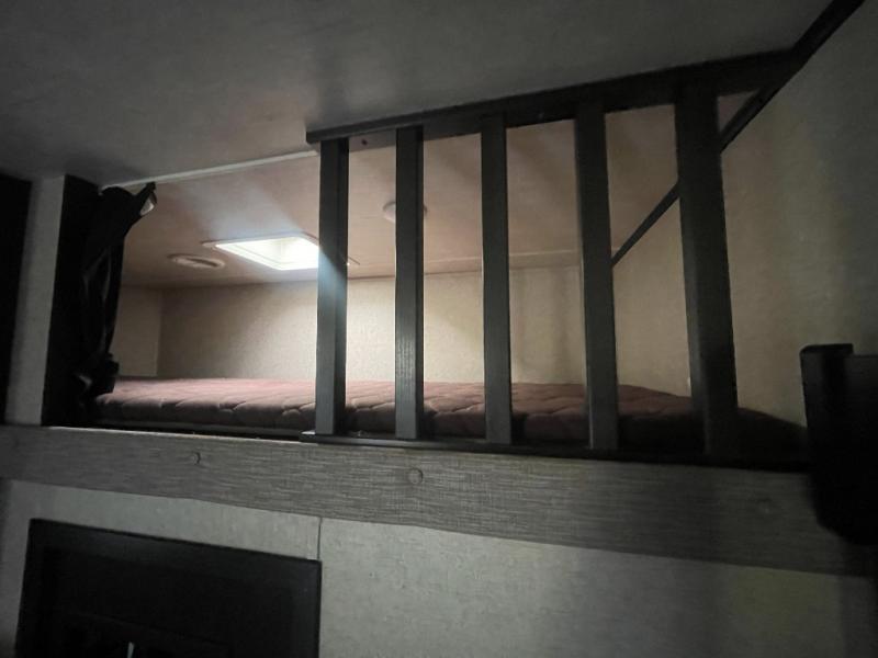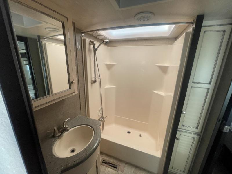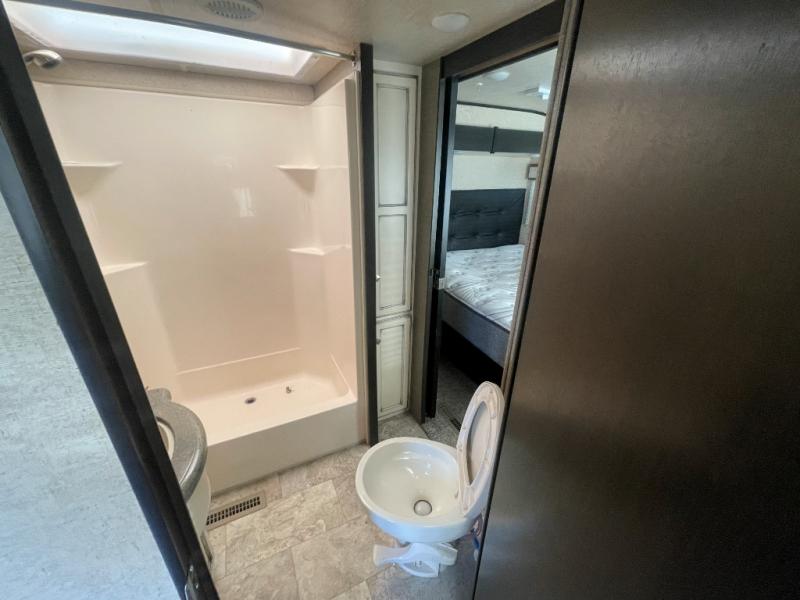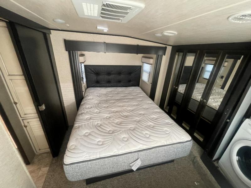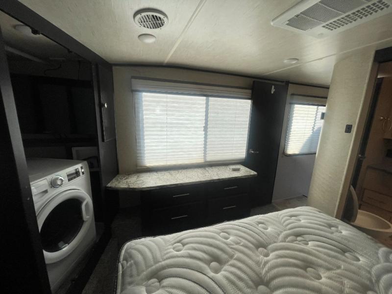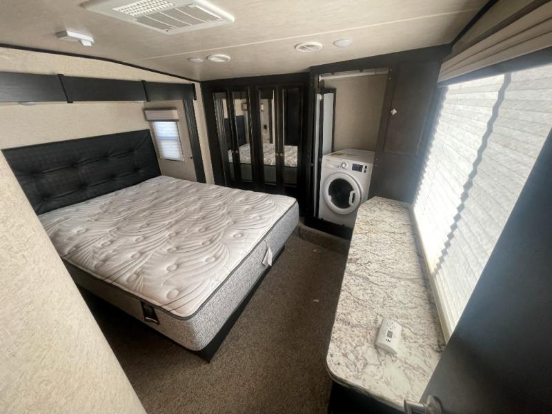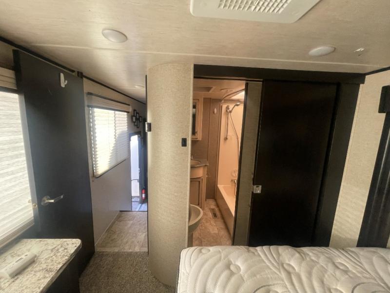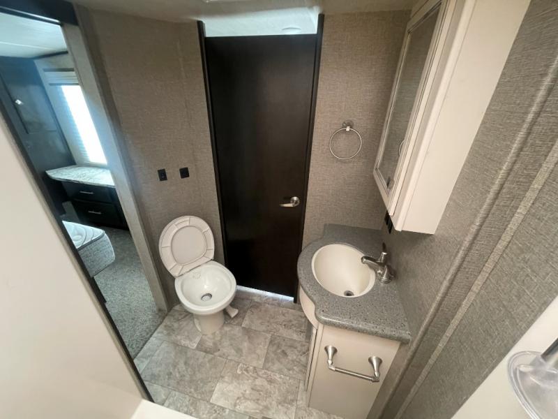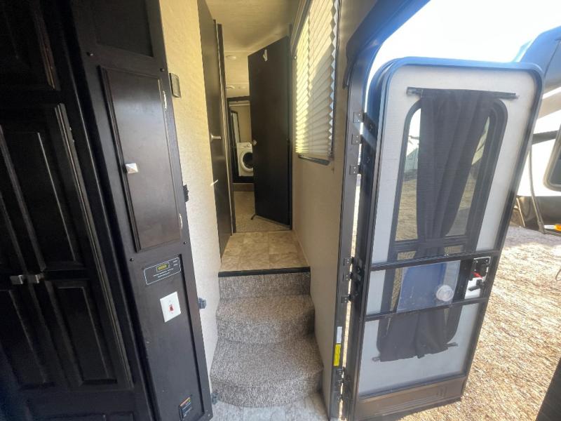 Head up two steps in front that lead to a side aisle bath and front bedroom. The bathroom includes a tub/shower, toilet, sink, and linen cabinet. A sliding door leads to the front master bedroom which includes a slide out queen bed, a front wall wardrobe that has been prepped for a washer and dryer if you choose to add, and a dresser along the curb side, plus so much more!