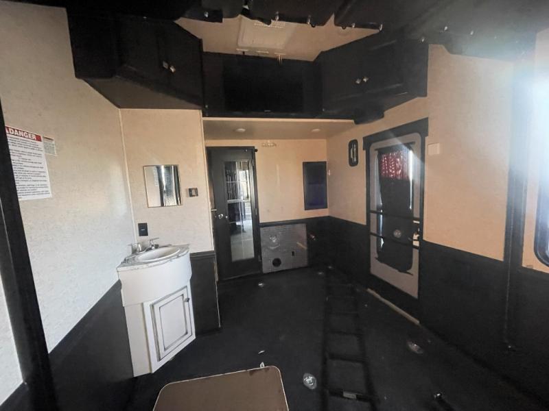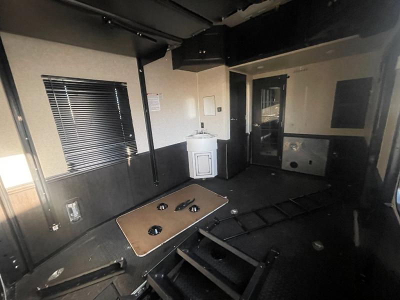 Step inside the main living area through the garage interior door, or from the side main entrance along the curb side. Here you will find a combined kitchen and living area with dual opposing slide outs. There is a slide out refrigerator and sofa along the curb side. You will also find a corner entertainment center with flat screen TV just off the slide. Opposite enjoy a slide out L-sofa with table, and the rest of the kitchen area which includes a counter with large single sink, a three burner range, and storage cabinetry along the interior wall.