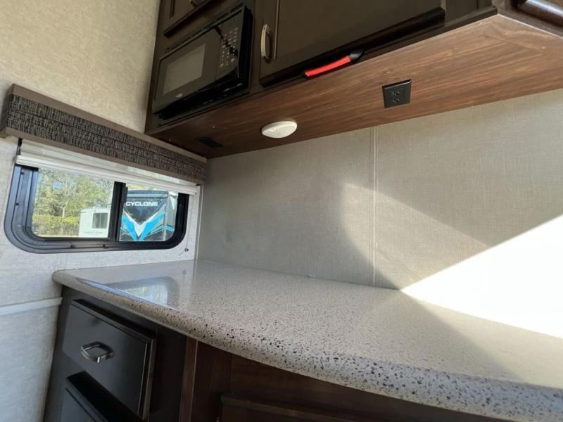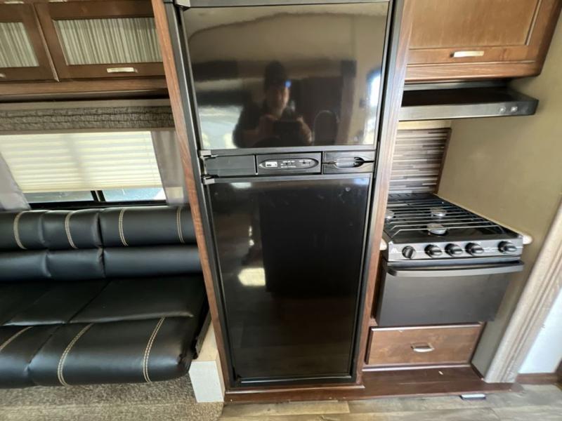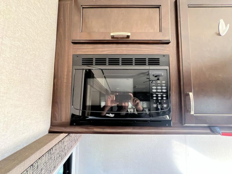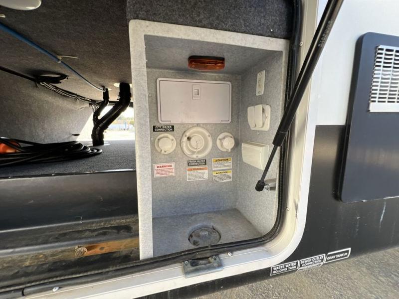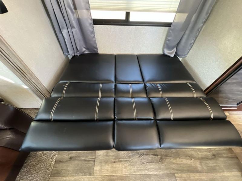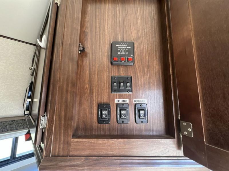 Step inside and notice the open concept living space with the dual opposing slides fully expanded. There is a corner storage/entertainment center and free standing dining table for four in the slide to your immediate left. Across the rear wall you will find two lounge chairs and a bit of storage in upper cabinets that stretch the entire width of the unit.