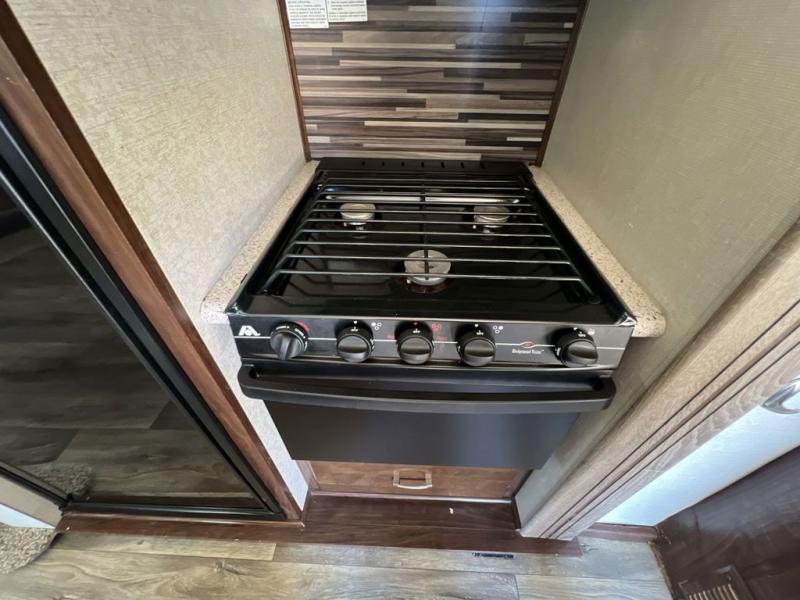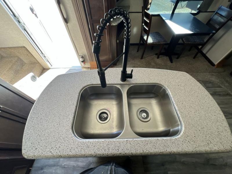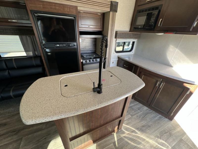 Along the road side you will find a second slide that features a sofa with storage above, and the kitchen refrigerator and three burner range which makes it easy to do your own cooking while away from home. You will find generous counter space along the interior wall, and more with the convenient kitchen island in the center which also includes a double sink for cleaning up. You will also find ample storage here as well.