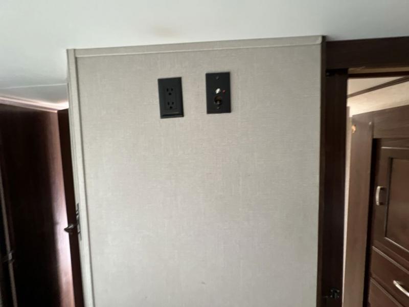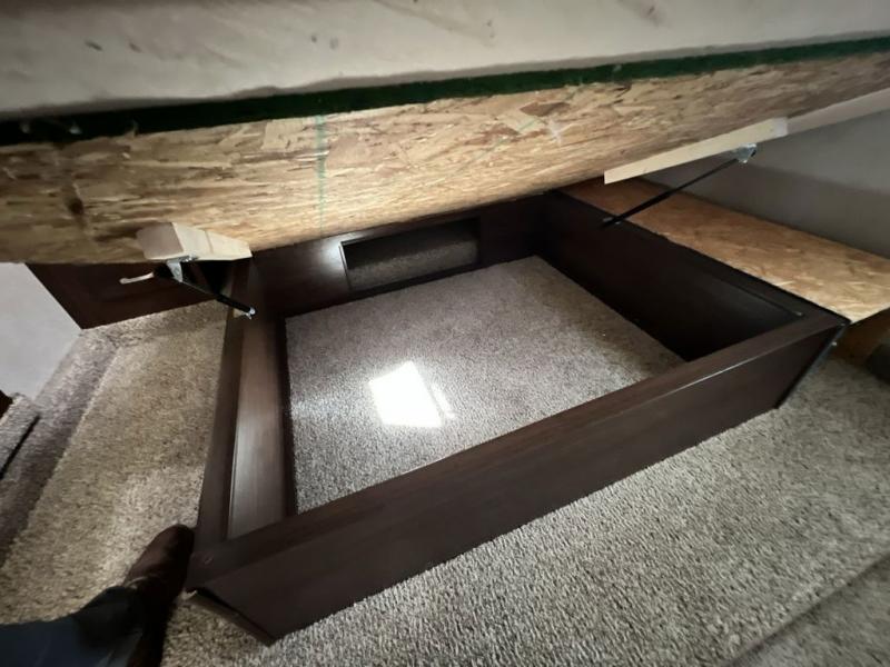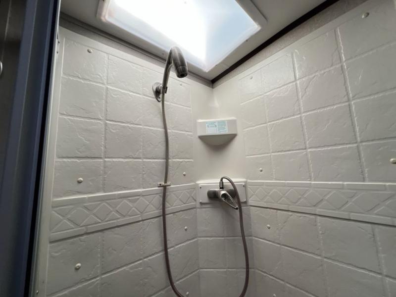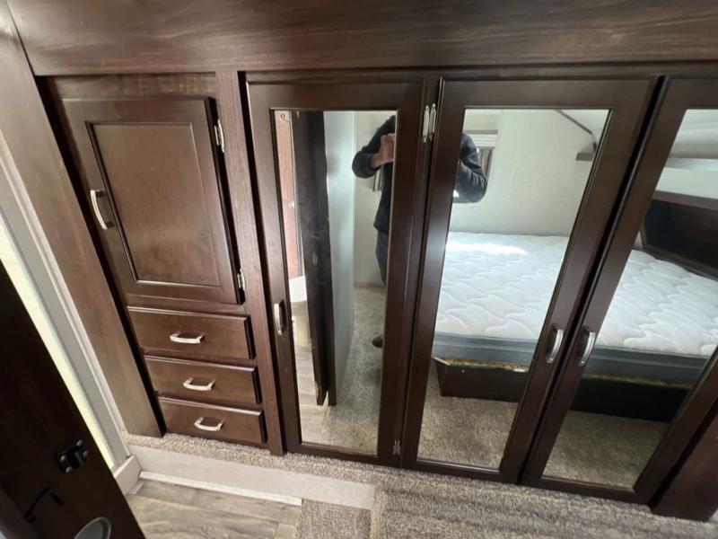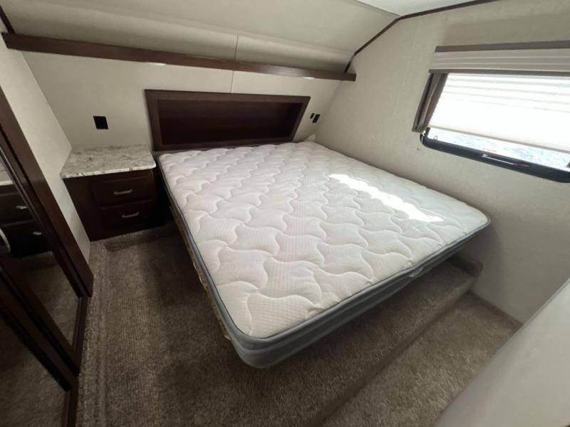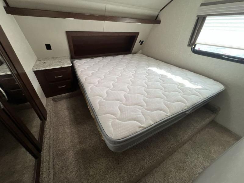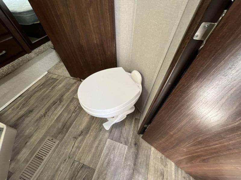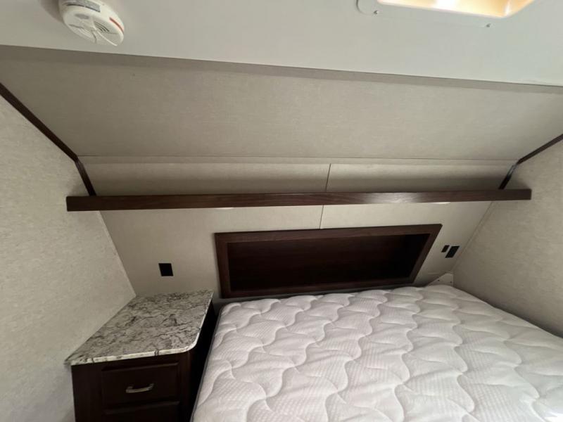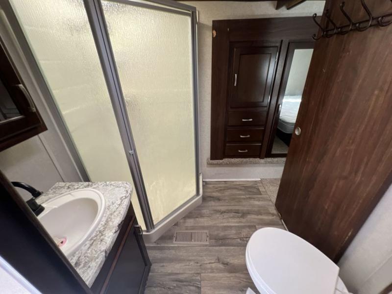 Head up the steps to the front bedroom and complete side aisle bath. At the top of the steps on your left enjoy an angled shower, toilet, and vanity with sink, plus an overhead medicine cabinet. There is a convenient second bath door that allows access into the bedroom, plus there is linen storage inside the bath from the bedroom slide out.