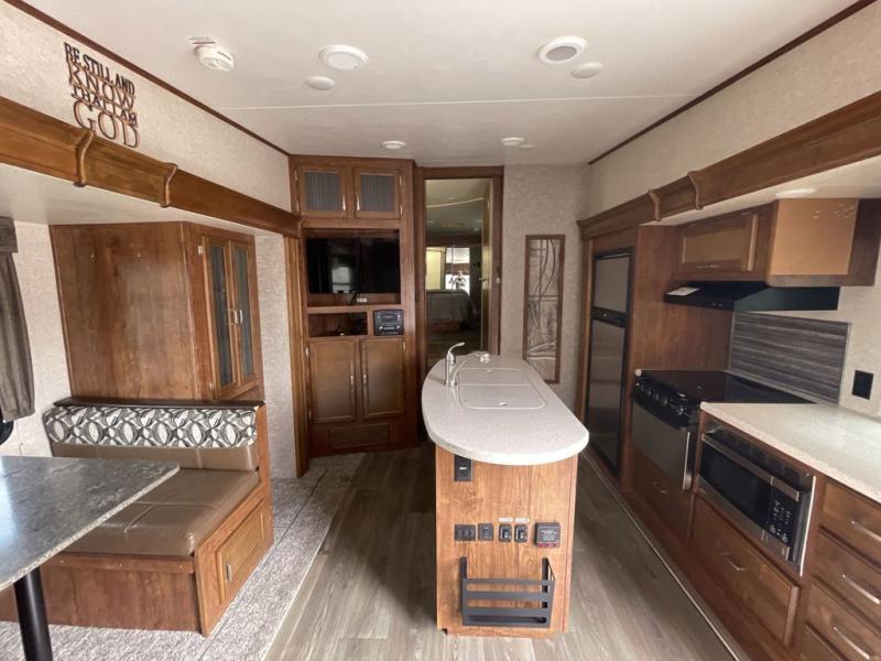 The rear wall features two lounge chairs, and overhead cabinets the entire width of the unit. Across from the kitchen, the second living area slide features a free-standing table with chairs and pantry. The entertainment center is next to the the booth dinette slide on the interior wall of the fifth wheel.