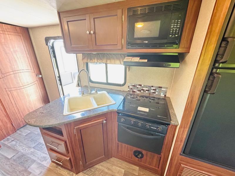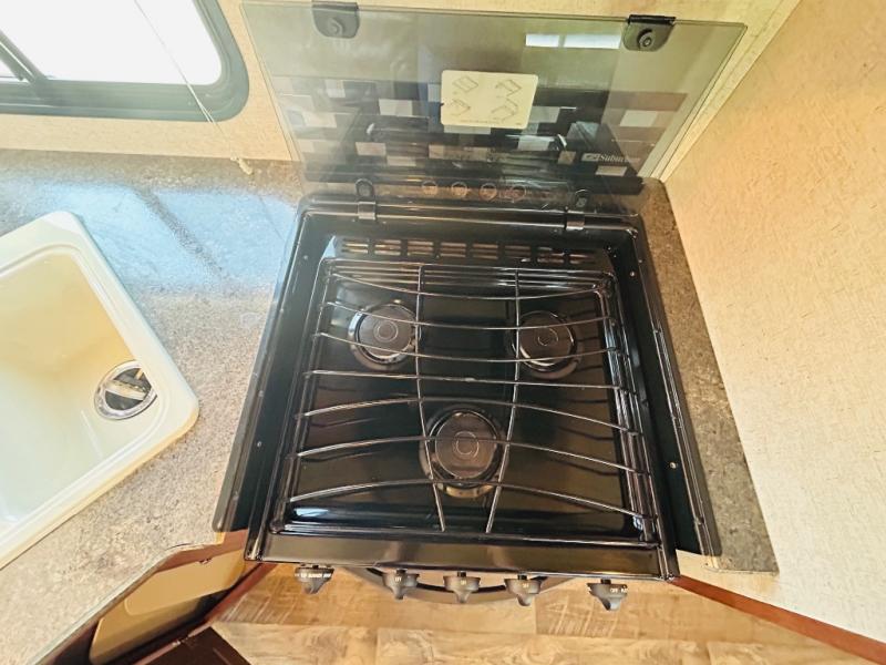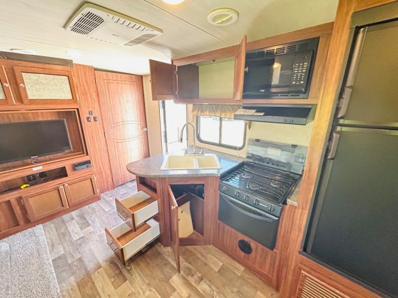 The living and kitchen area are combined and feature a large slide out sofa and u-shaped dinette for added walking around space. The sofa features overhead storage, and there is ample seating between the two for mealtime and more.