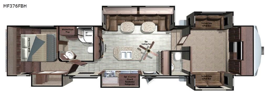 Step inside model MF376FBH and find yourself in the kitchen and living area. There is a counter to your right with overhead cabinets. A convenient place to drop off groceries when coming inside. The off set island also provides added counter space, plus it features a double kitchen sink.
