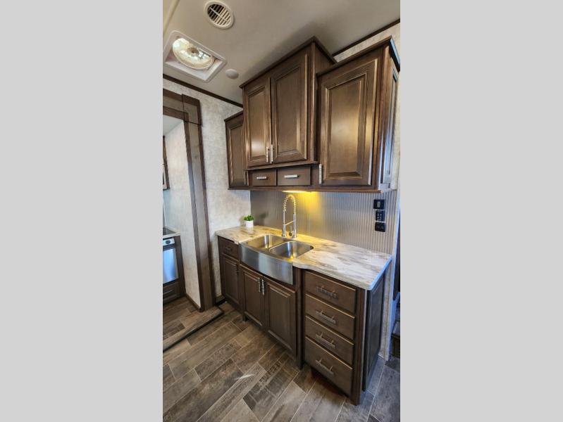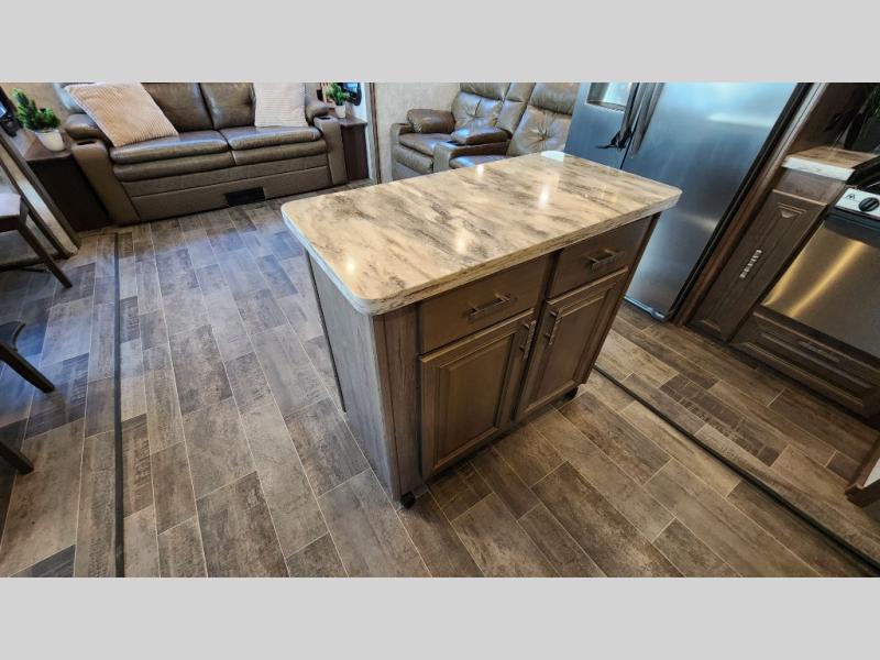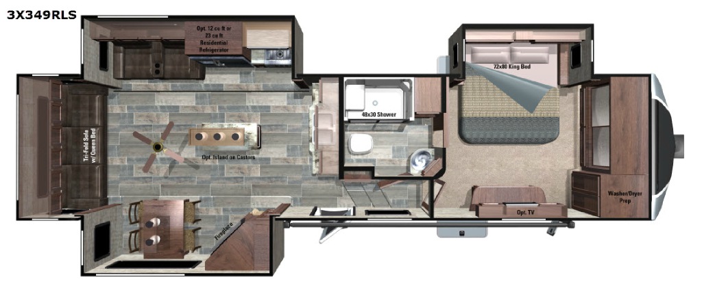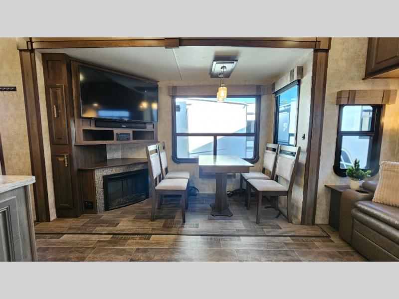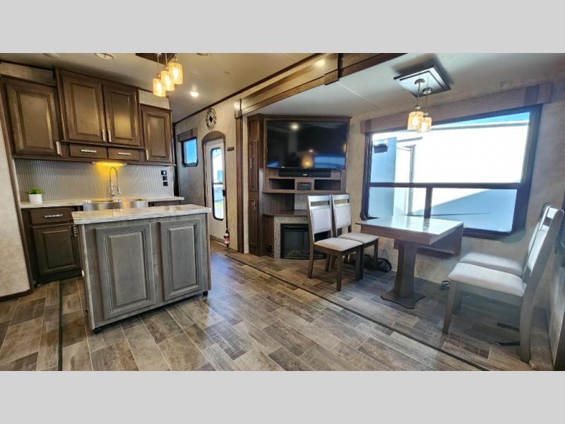 Enter model 349RLS and see how open the space is with dual opposing slides in the living and kitchen area combined. There is a slide out to the left of the door featuring a corner entertainment center and fireplace, plus a dining table with four chairs. There is also a counter area with double kitchen sink straight in from the door.