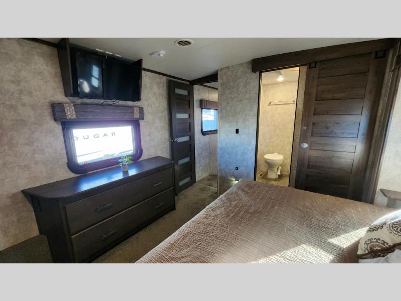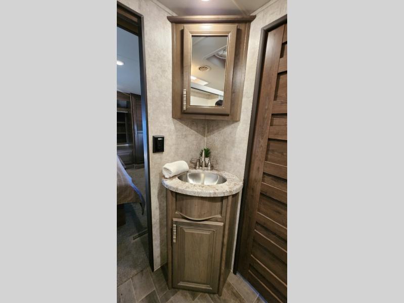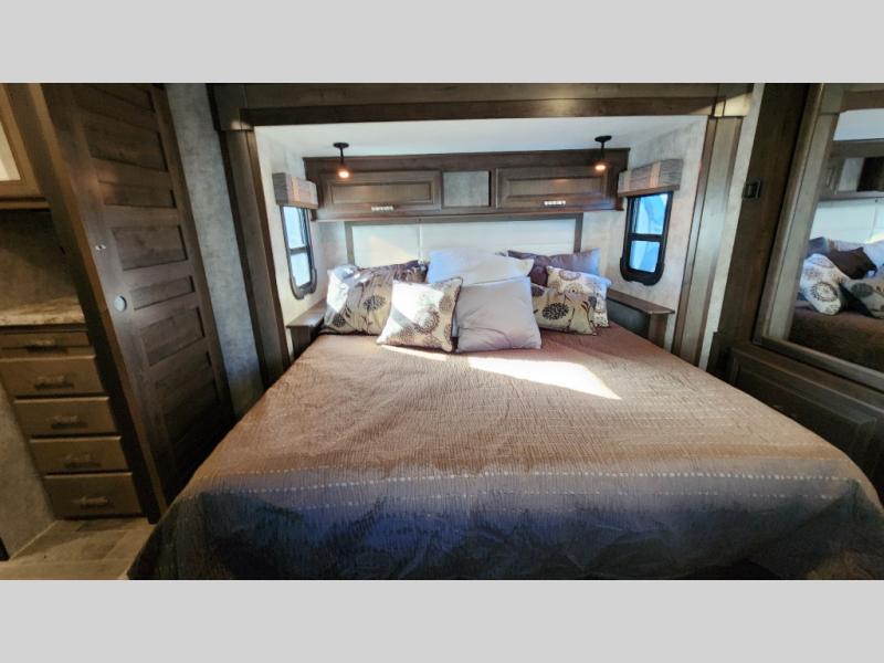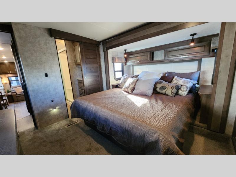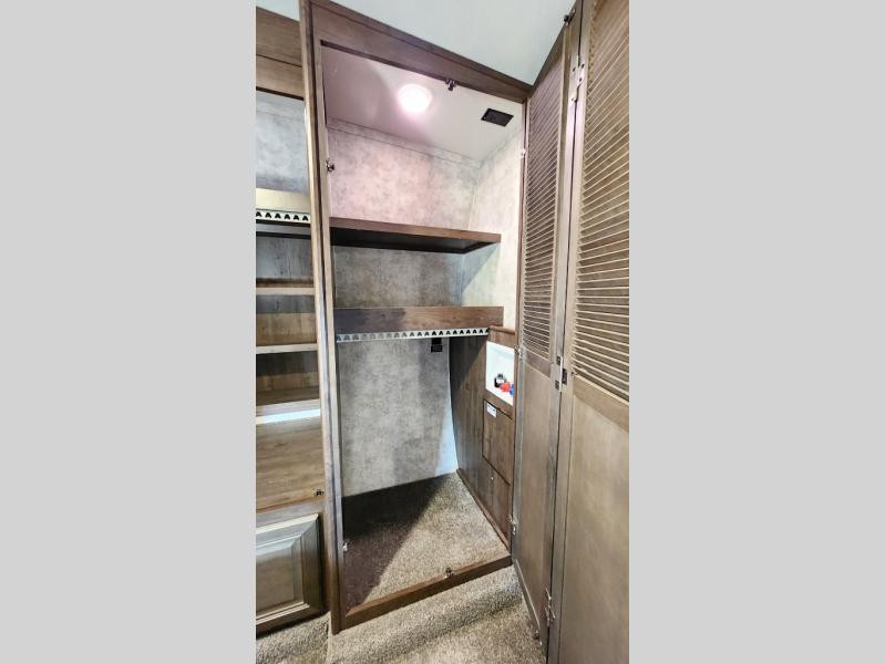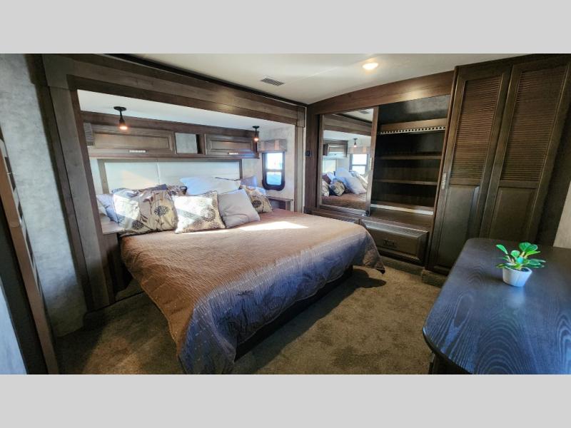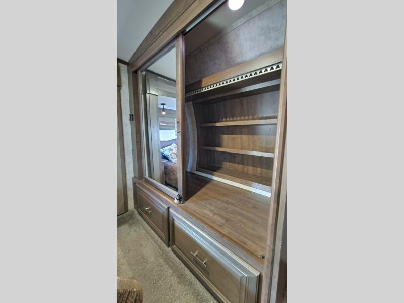 The bedroom also has an entry at the head of the hall. Inside find a king size bed slide out with nightstands on either side, a chest of drawers with optional TV above, and a front wall wardrobe with sliding mirrored doors, plus a closet that has been prepped with a washer and dryer for added convenience.