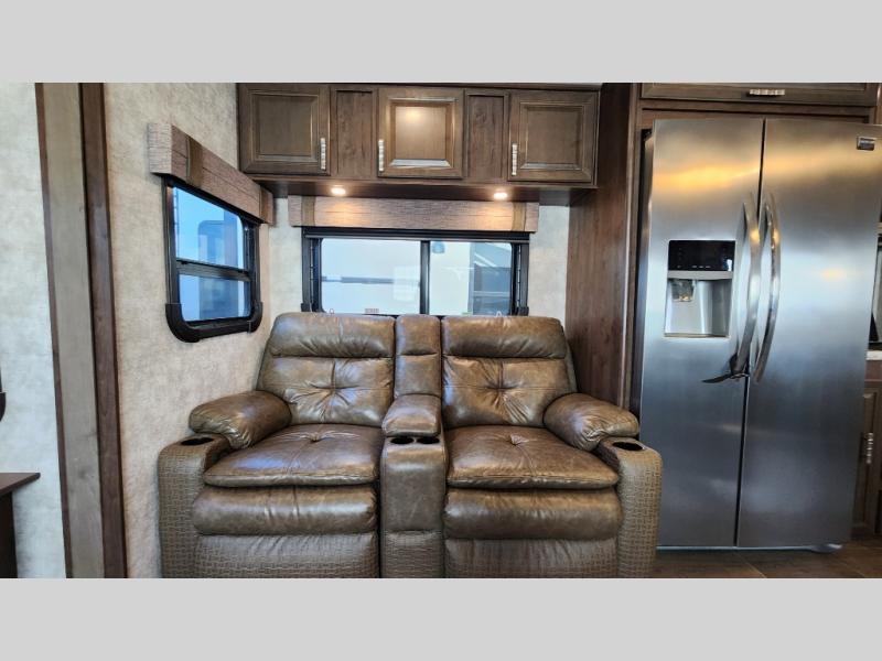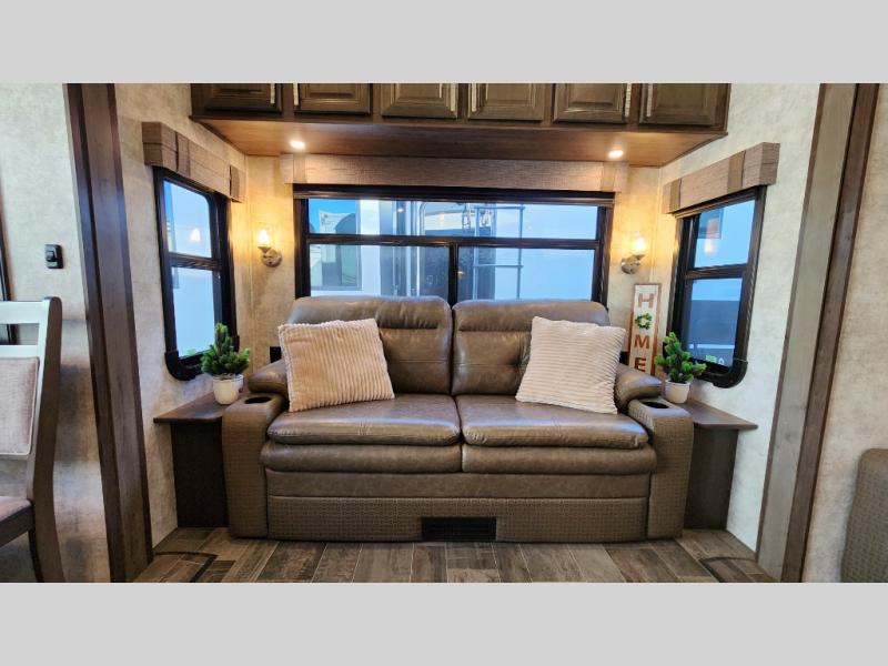 The rear of this fifth wheel provides more seating with a tri-fold sofa with queen bed including overhead cabinets.