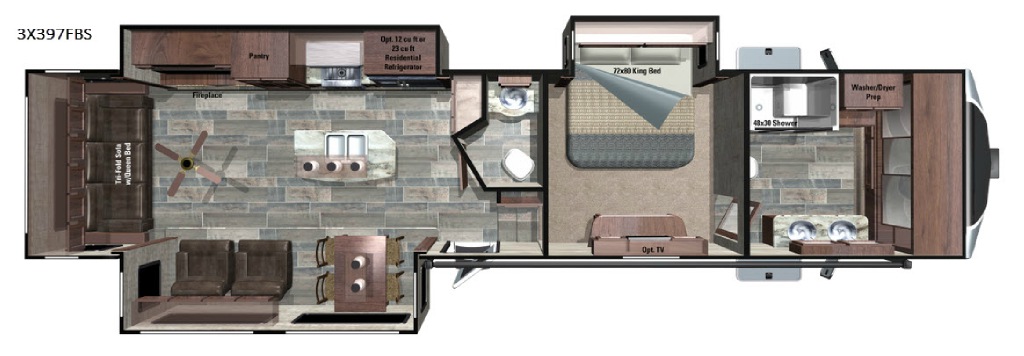 Opposite the door side enjoy a slide out entertainment center with a fireplace below, a pantry, three burner range, convection microwave, and a refrigerator. Plus you are sure to enjoy the kitchen island with double sinks for easy clean up or serving meals. You can even choose a 12 cu. ft. or 23 cu. ft. residential refrigerator, if you like, plus so much more!