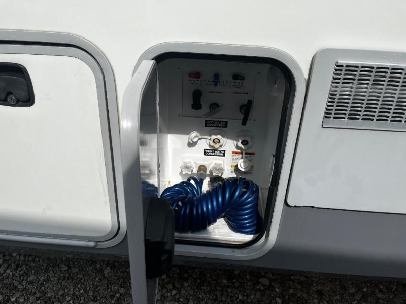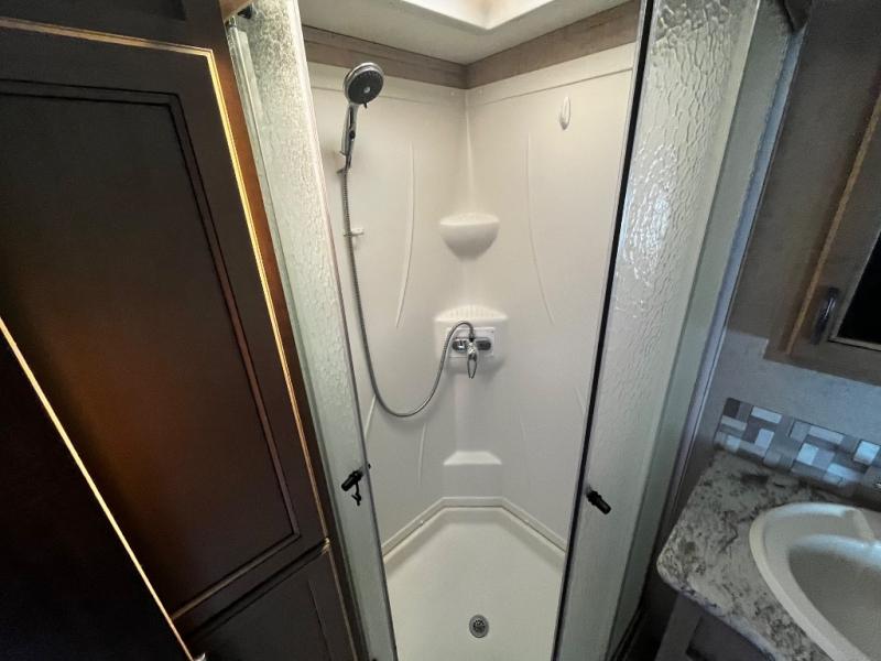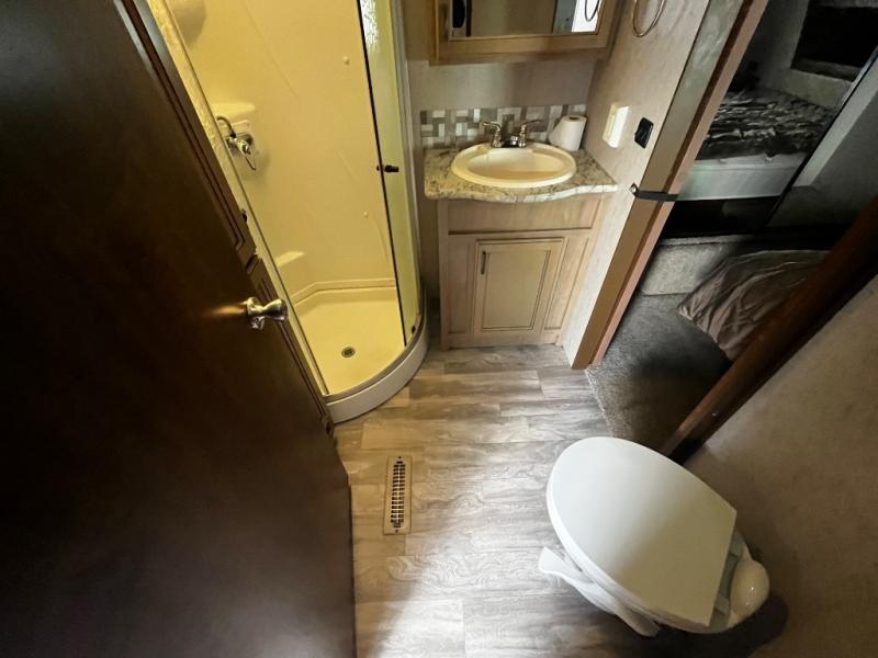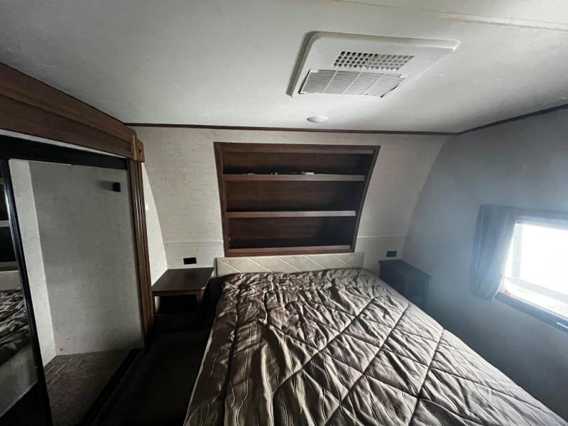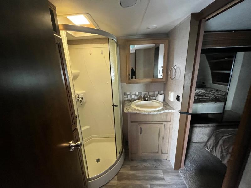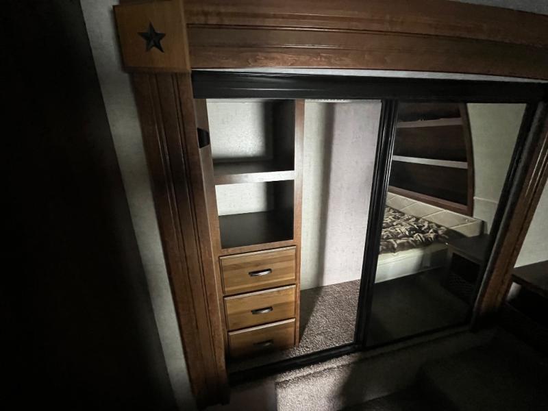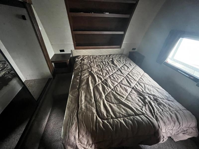 Inside you will find a private front bedroom with a queen size bed and nightstands on each side with open storage and a cargo net below. There is also shelving along the front wall at the head of the bed for storing decor and things. And the slide out wardrobe along the road side wall provides added floor space when extended, and includes shelves and drawers. The bath is conveniently accessible from within the bedroom using the sliding pocket door.