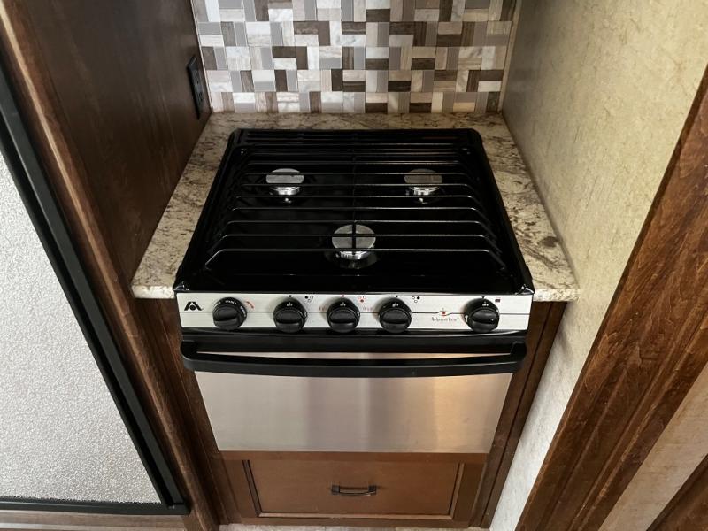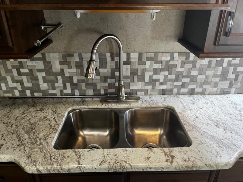 Head back towards the front and down the steps just passed the bath to the combined living and kitchen area. As you enter the living space you will see a slide out with two recliners on the door side. The slide opposite features a three burner range, microwave, refrigerator, and entertainment center and fireplace. Along the interior wall there is a double kitchen sink, overhead cabinets for dishes and things, plus plenty of counter space for food prep and more. The rear wall features a tri-fold sofa with queen bed including end tables and overhead cabinets for additional storage.