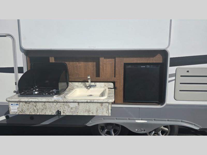 On the outside of this unit enjoy an exterior kitchen which features a refrigerator, single sink, and three burner cook-top, plus so much more!