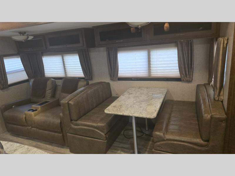 Along the rear wall there is a tri-fold sofa with queen bed including storage above to help keep things tidy and neat. The slide opposite features more seating with a theatre seat for two including cup holders, and a booth dinette. Both of which provide cabinets above for more storage needs. You can choose a U-lounge with fold-out queen bed and two tables option instead for seating and dining space if you wish.